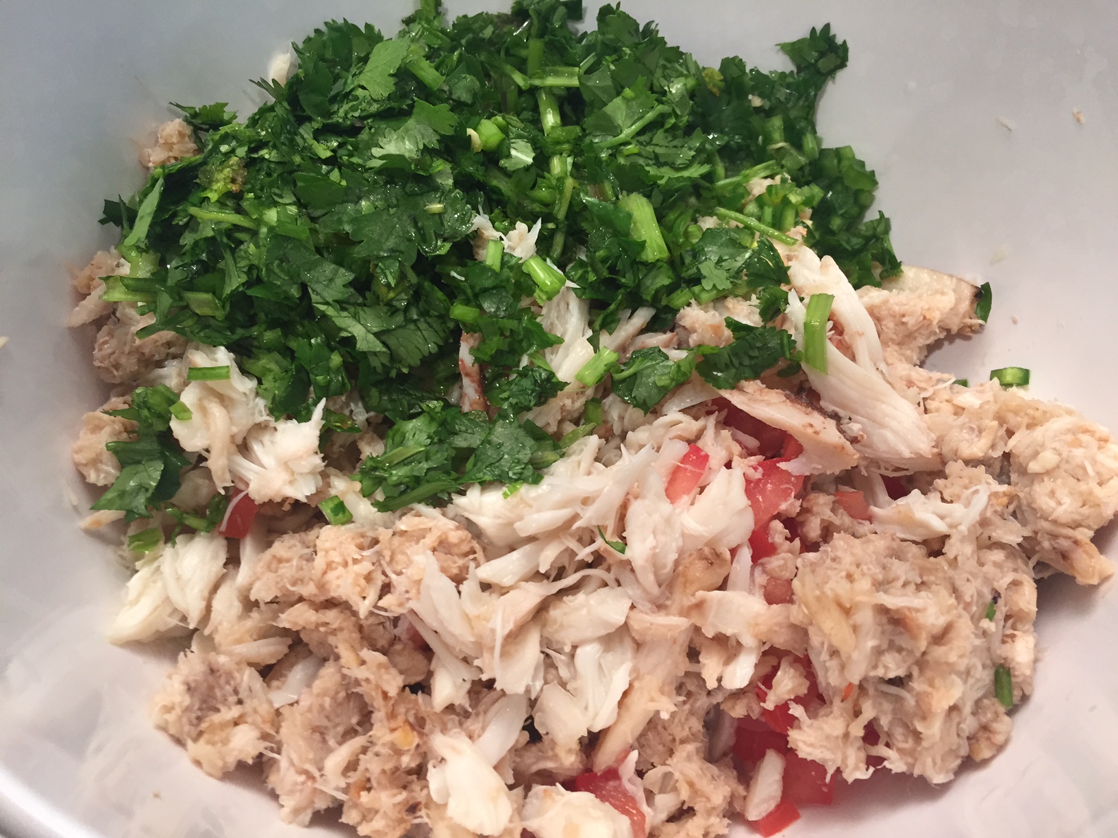 I make them in two ways – one is with guacamole as a binder – avocado, tomato, onion and cilantro