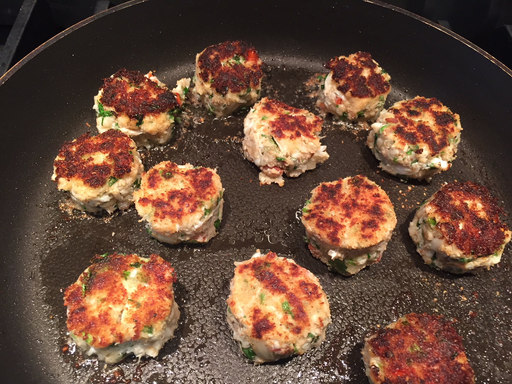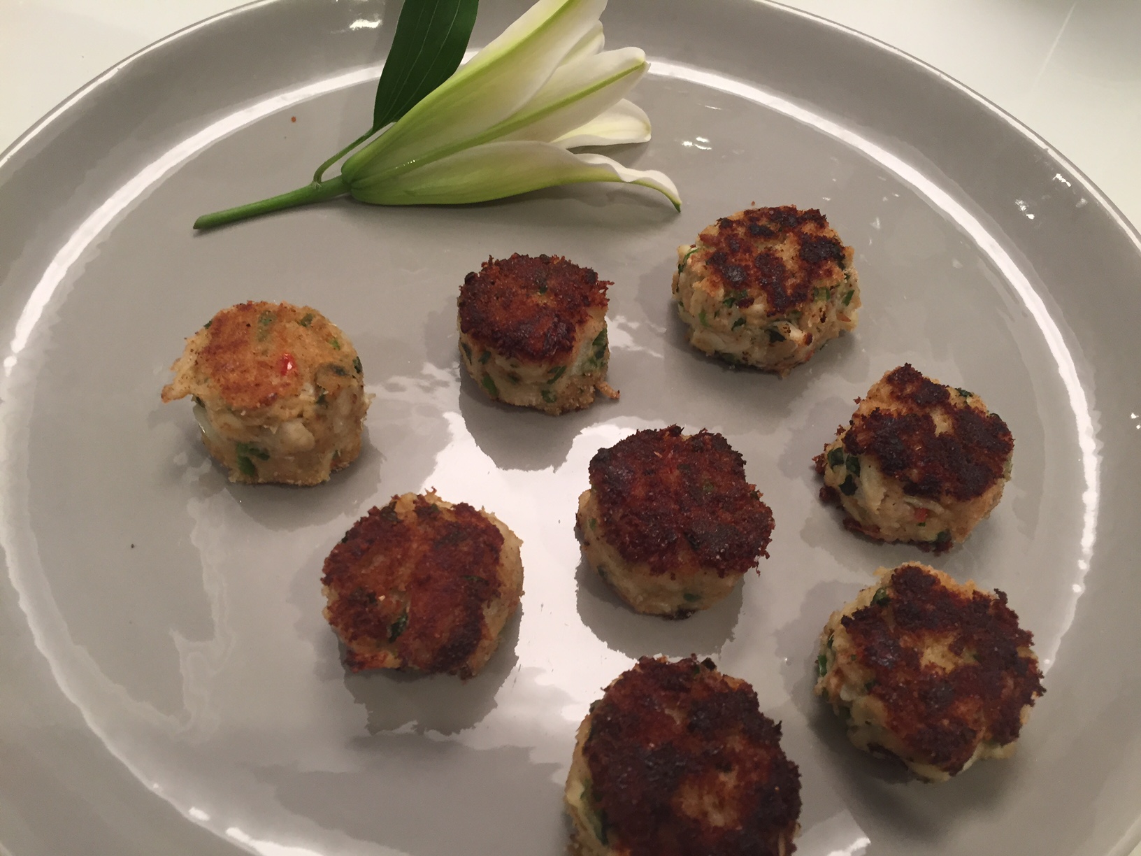 The picture above is of a crab cake when I serve it as a first course and the pictures below of the smaller cakes is when I do passed hors d’oeuvres where I will top them with an aioli.