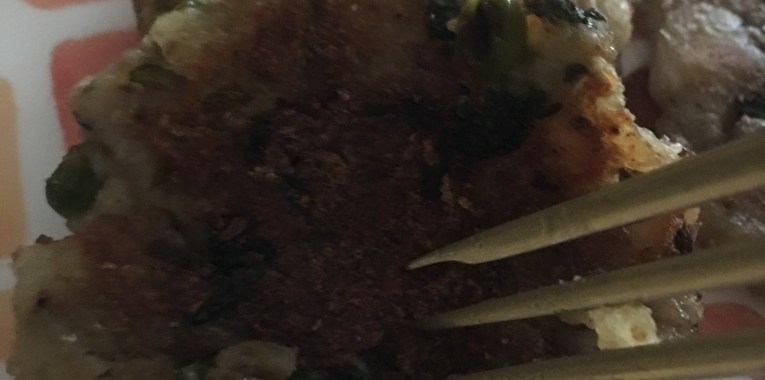 • I smashed left over tikkis from the night before and browned them in a skillet. They taste amazing with the larger surface area that is browned and remind me of spicy hash browns.