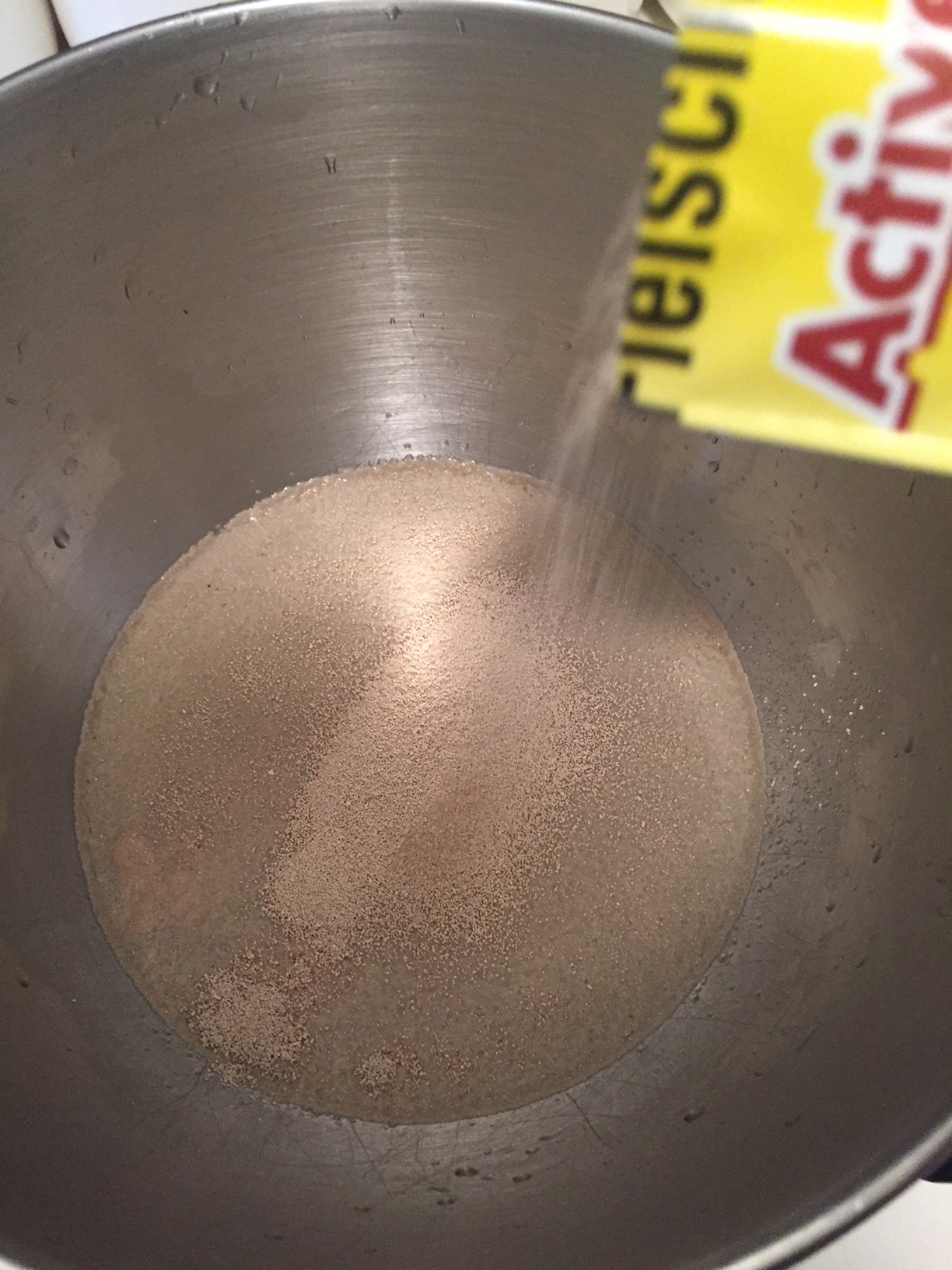 In 1/2 cup tepid water – about 140 degrees, add two packets of yeast along with a tsp. of sugar. Let sit.