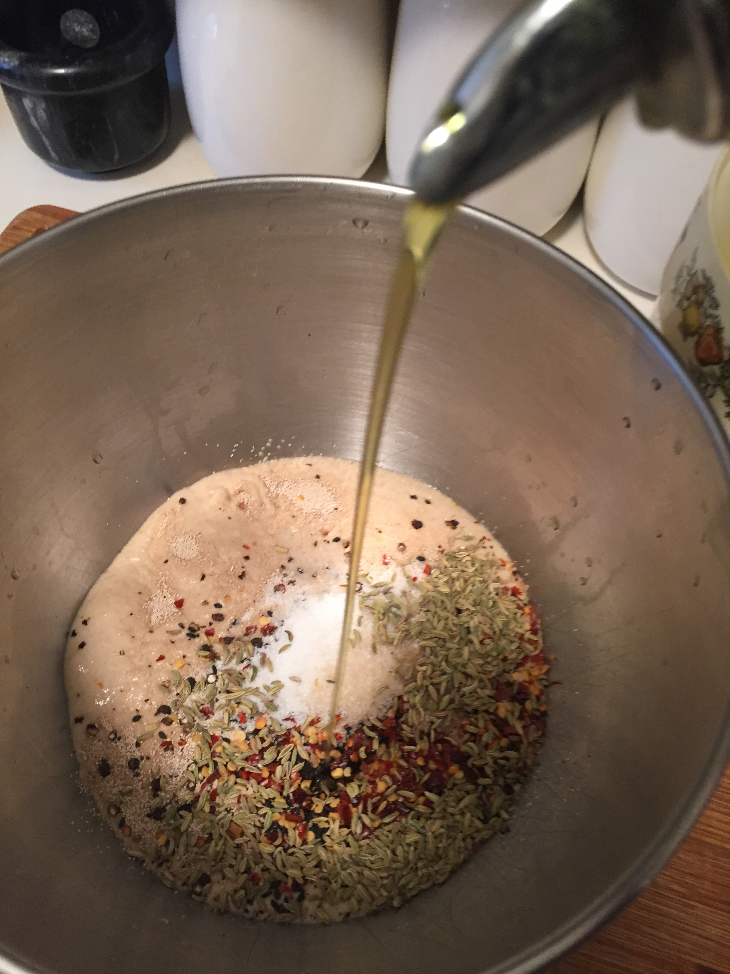 Add the water and yeast along with a 1/4 cup of olive oil.