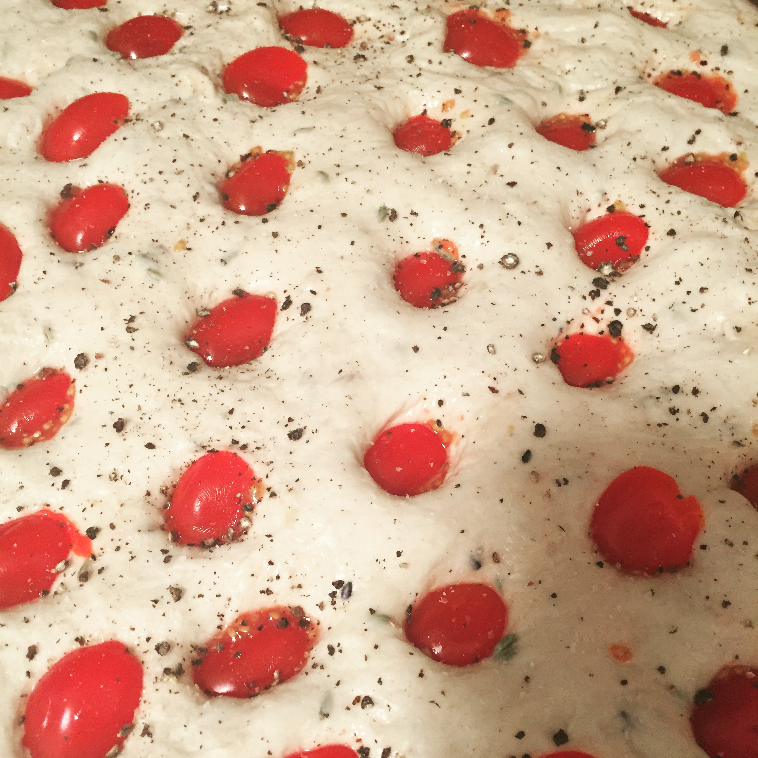 Let it rest for about 10 minutes and top as you please – here I have whole baby tomatoes and sprinkle with some salt and pepper. Drizzle some olive oil if you like and cook for 20 minutes or until the dough feels hollows when you tap it.