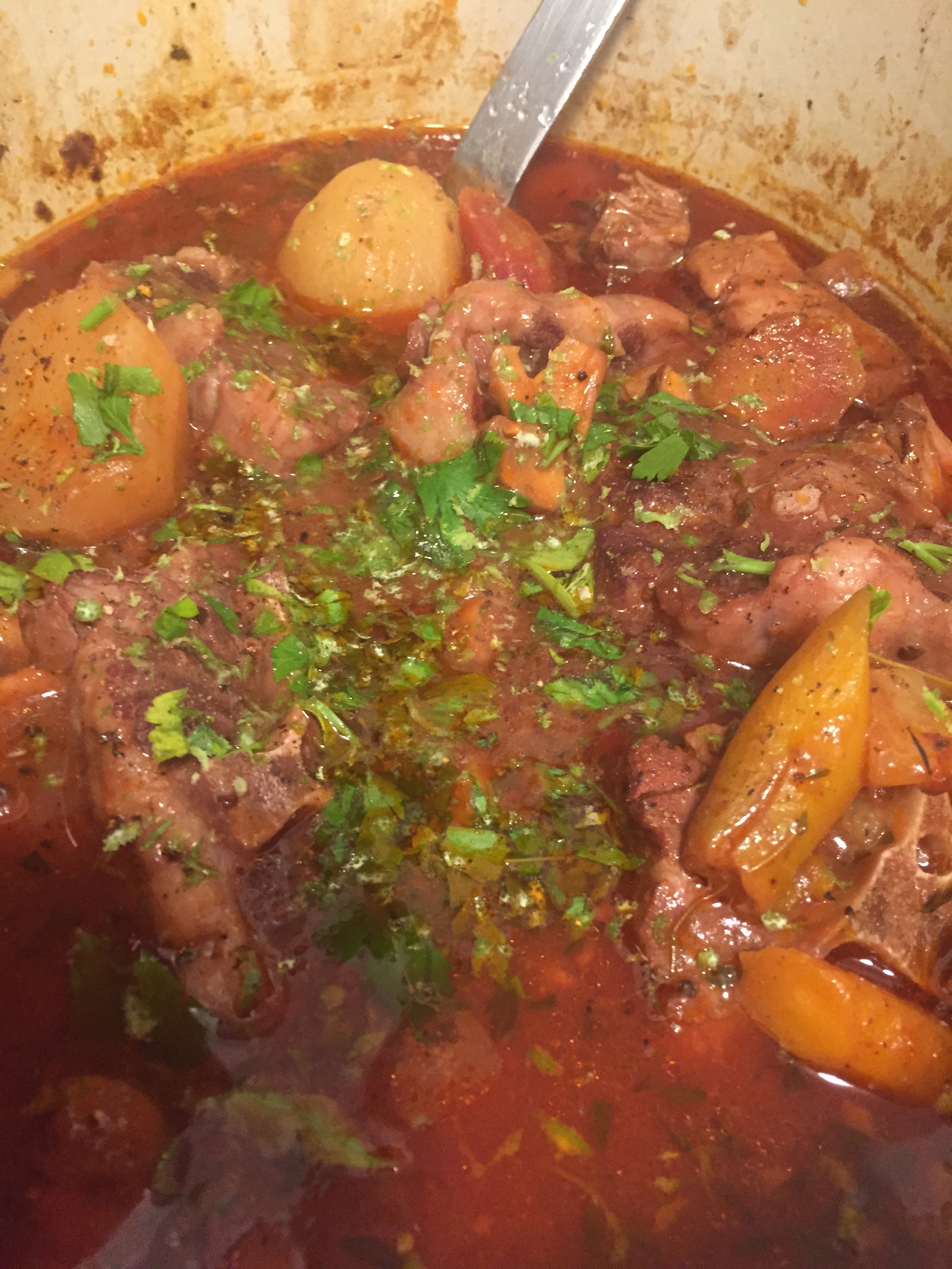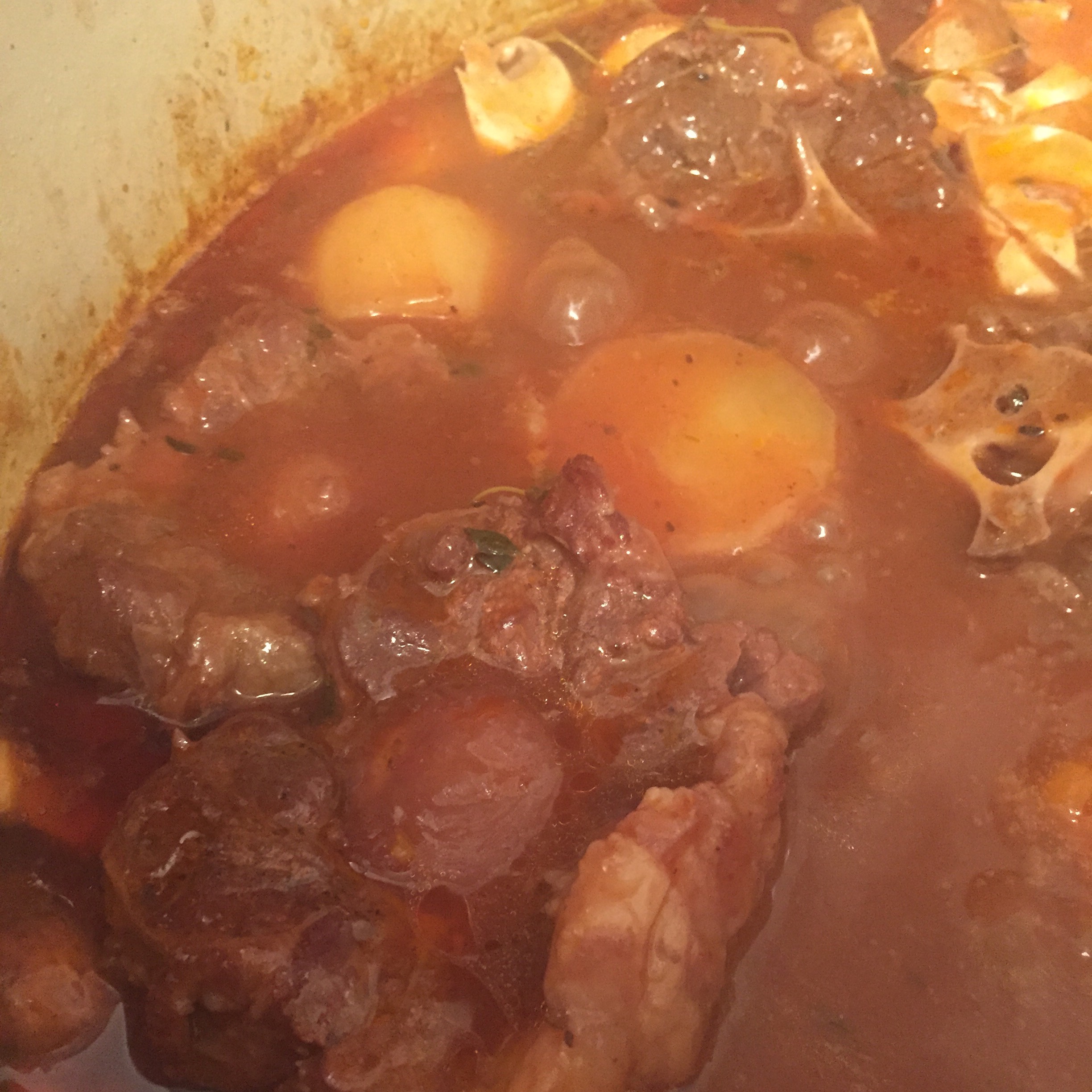 Add potatoes and any other vegetables you are using and cook another half hour to an hour till the meat is falling off the bone.
