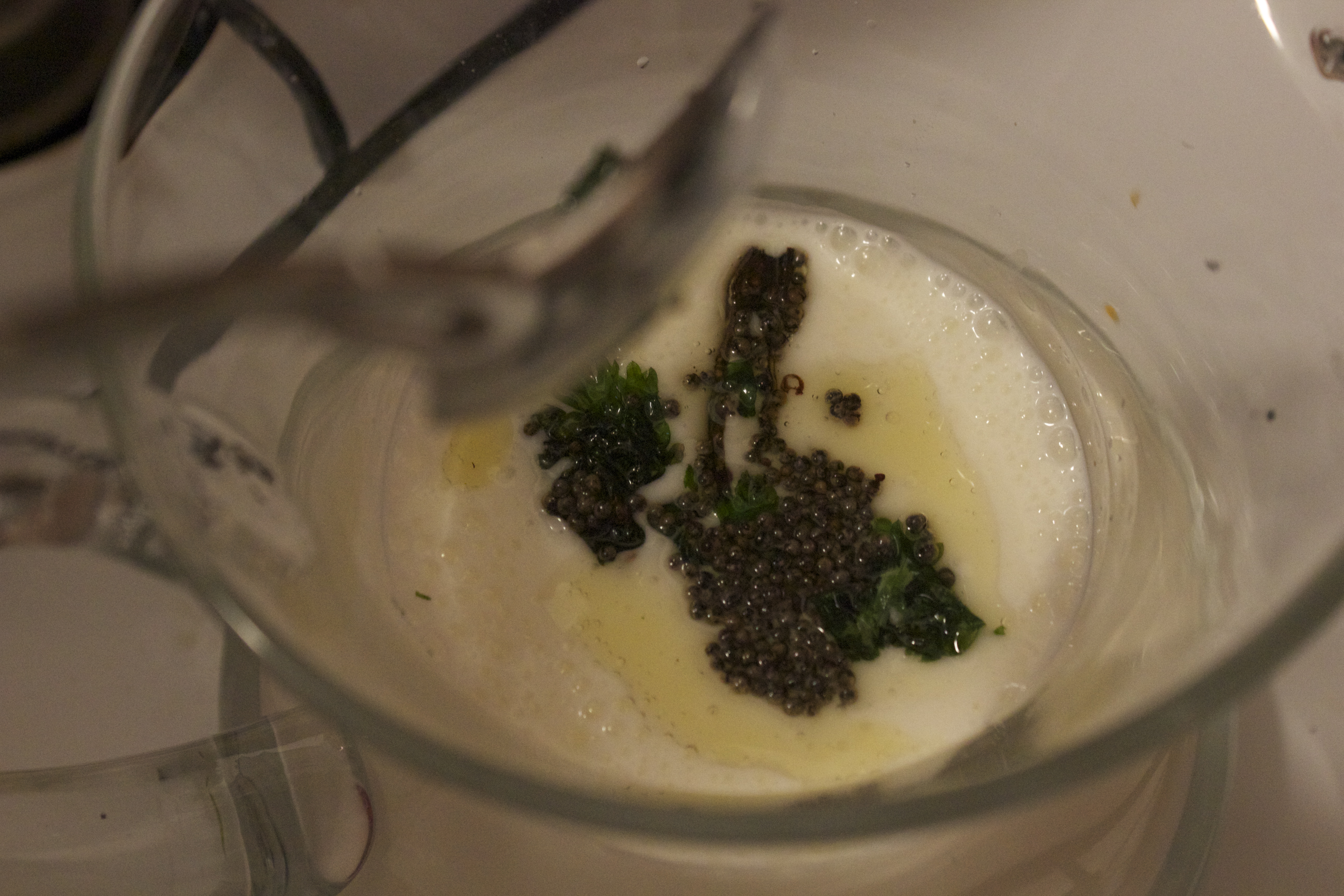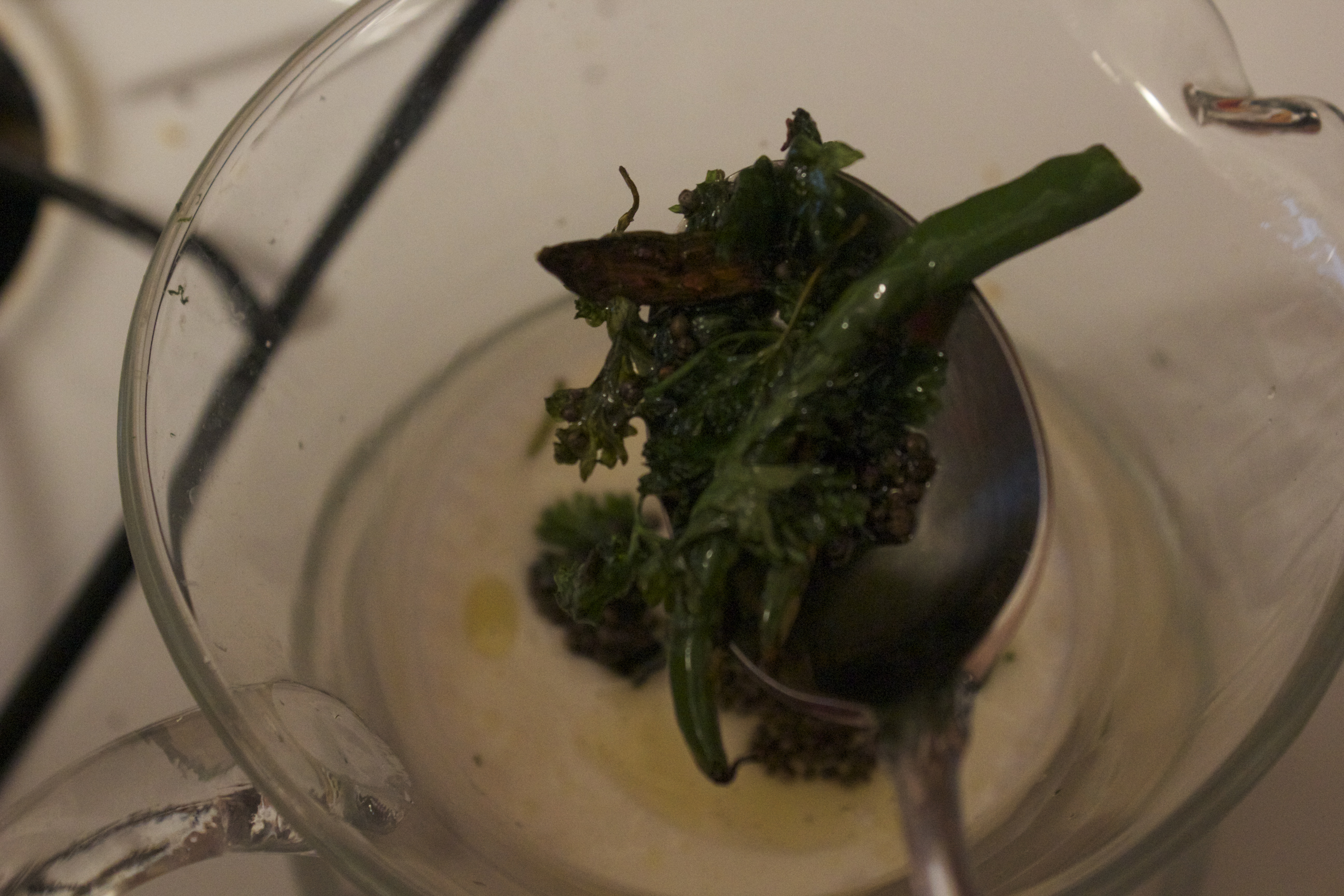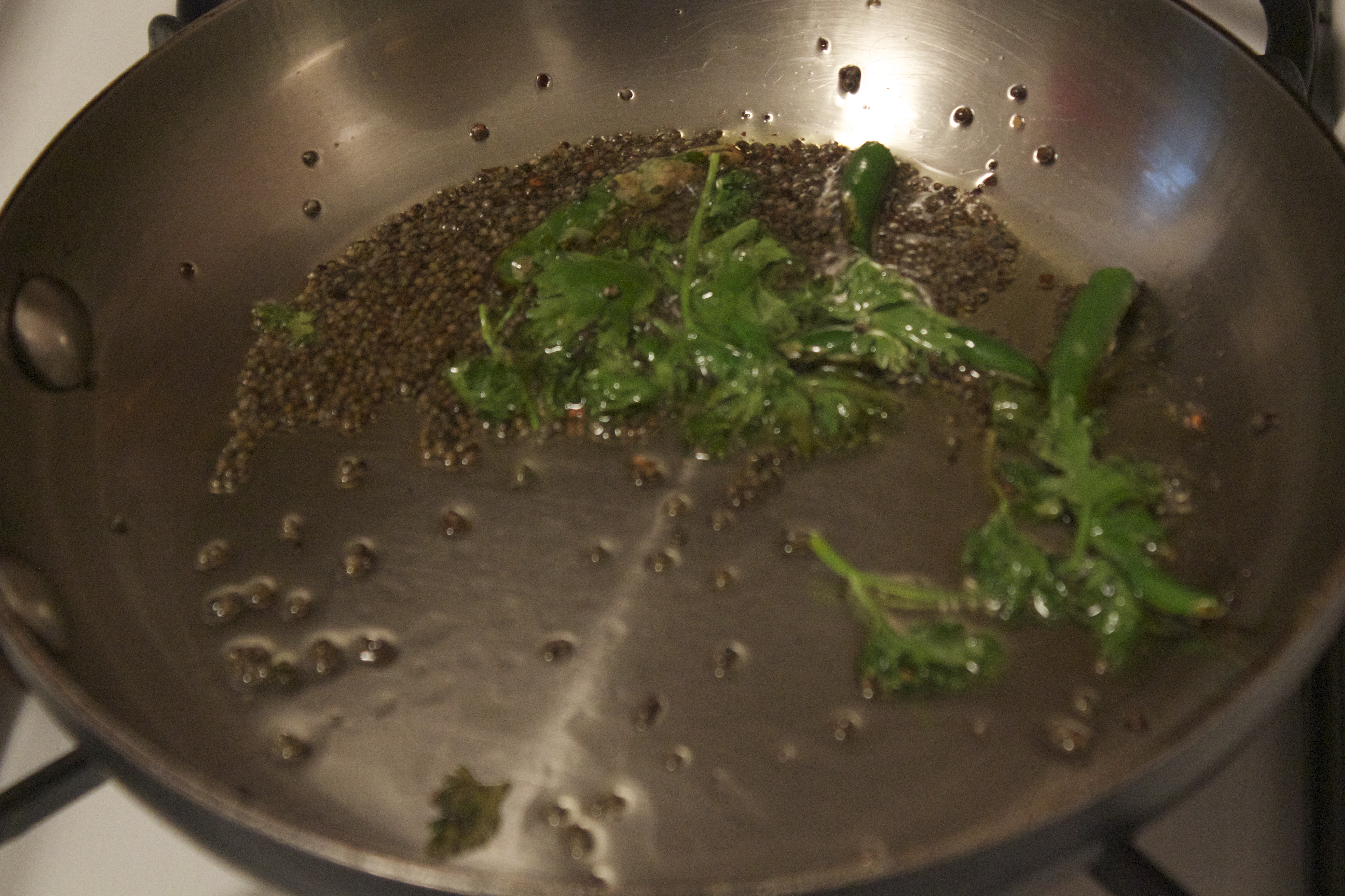 Heat up a scant tsp. of oil in a pan and add some mustard seeds, a couple of split green chilies, curry leaves and cilantro.