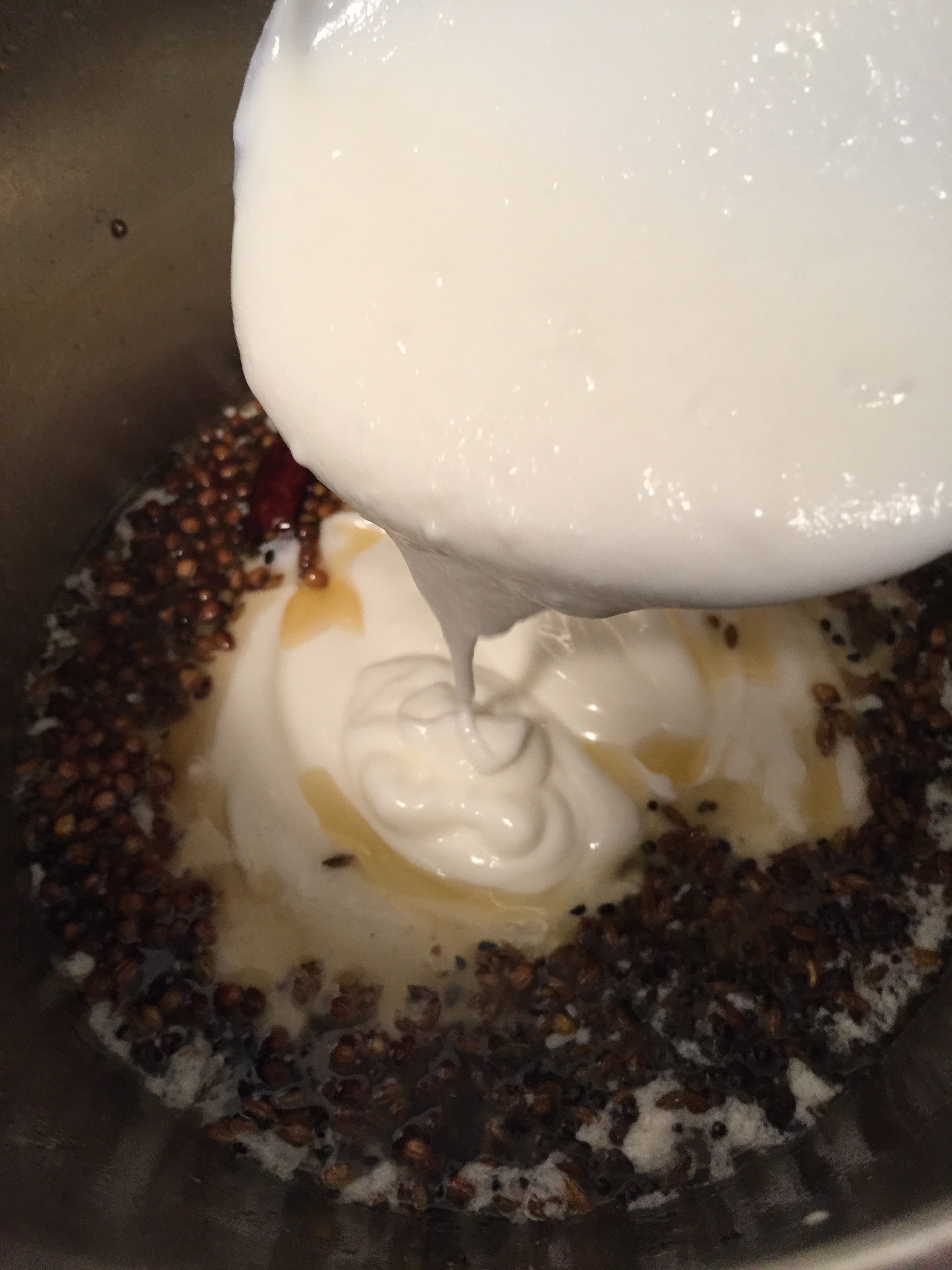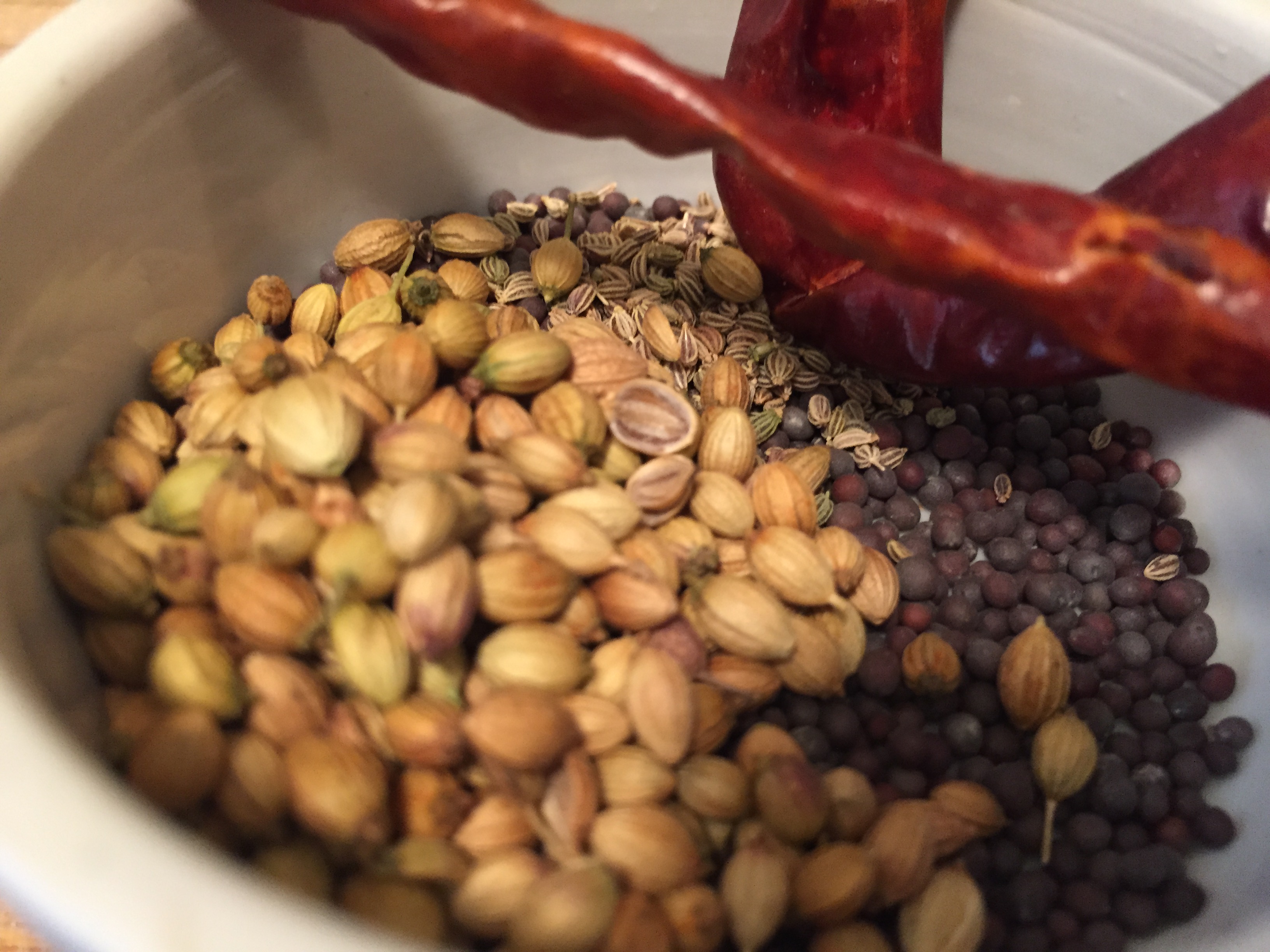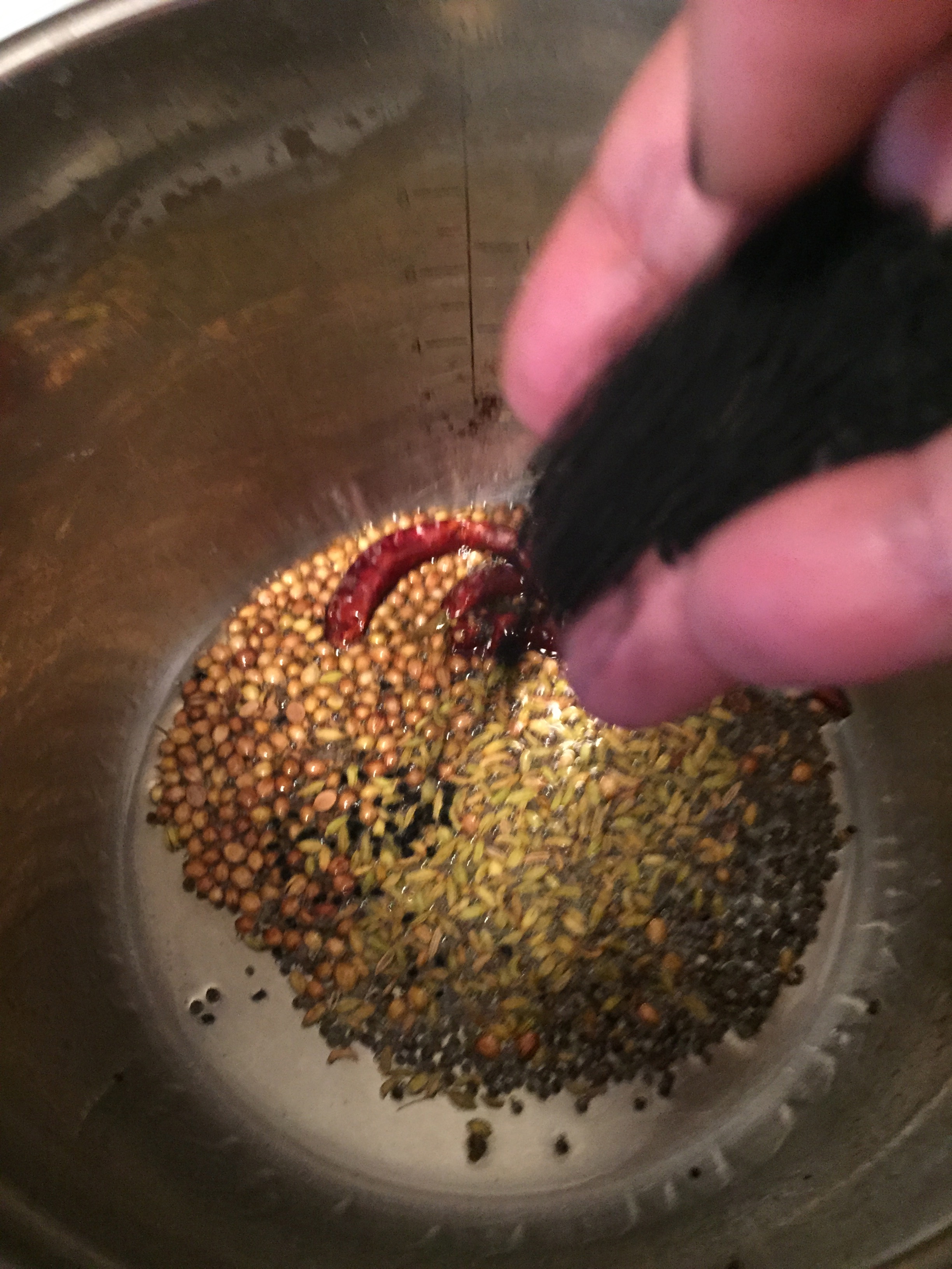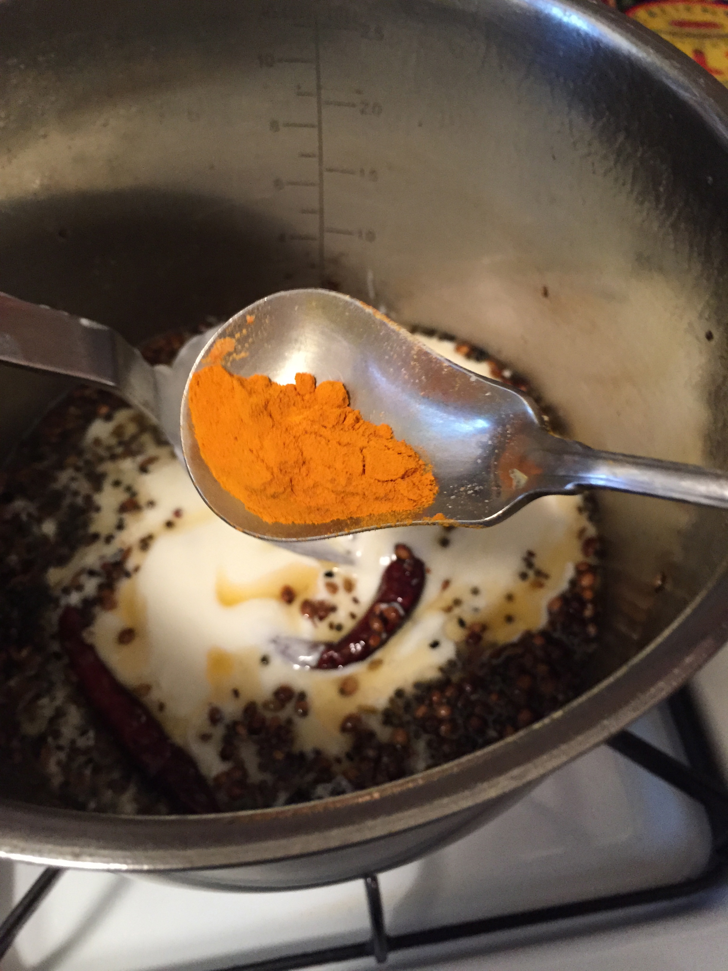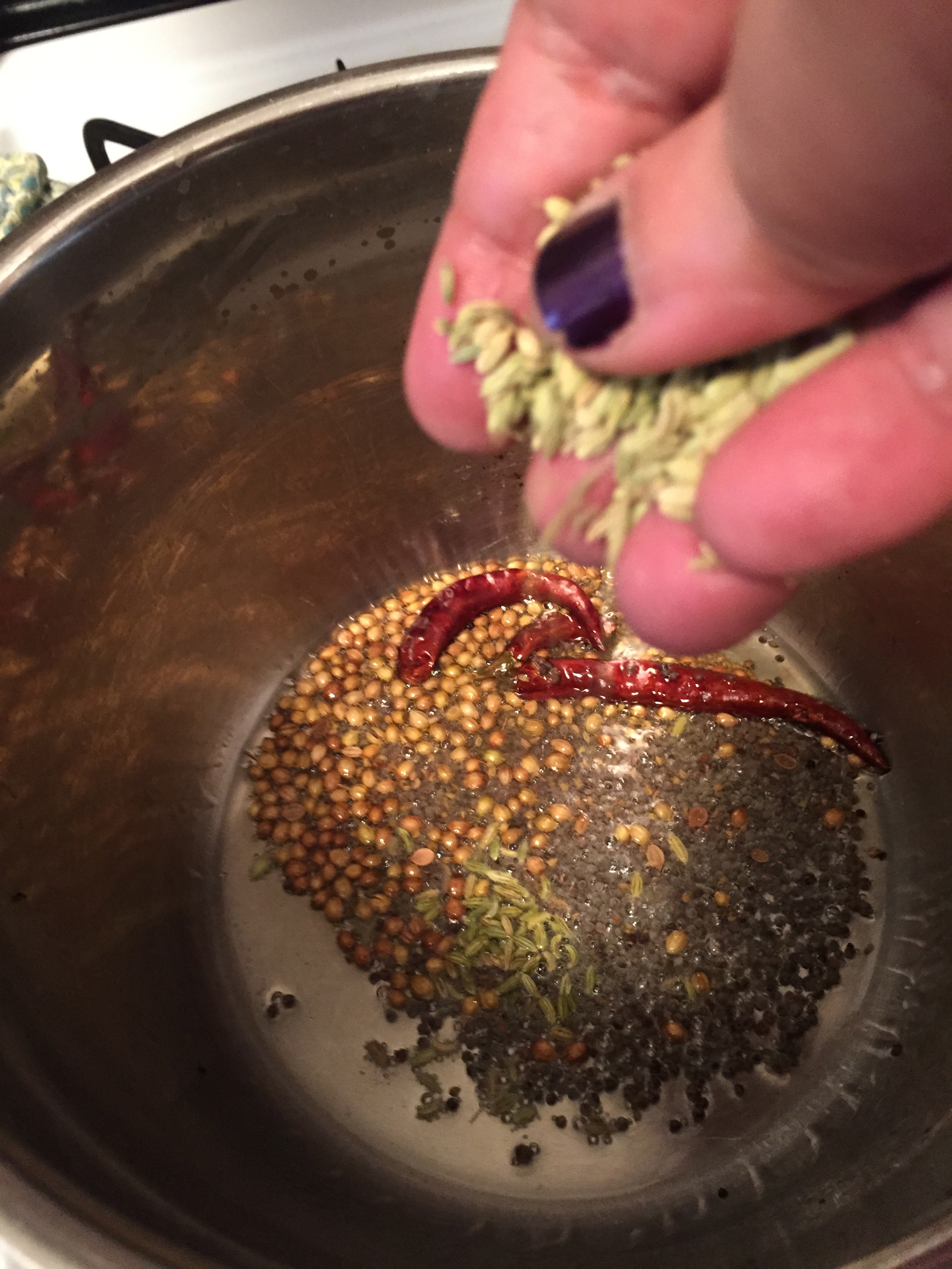 Heat up some oil and add all the spices except the mango powder and turmeric, and cook for a couple of minutes or until the black mustard seeds pop and you start to smell all the spices.