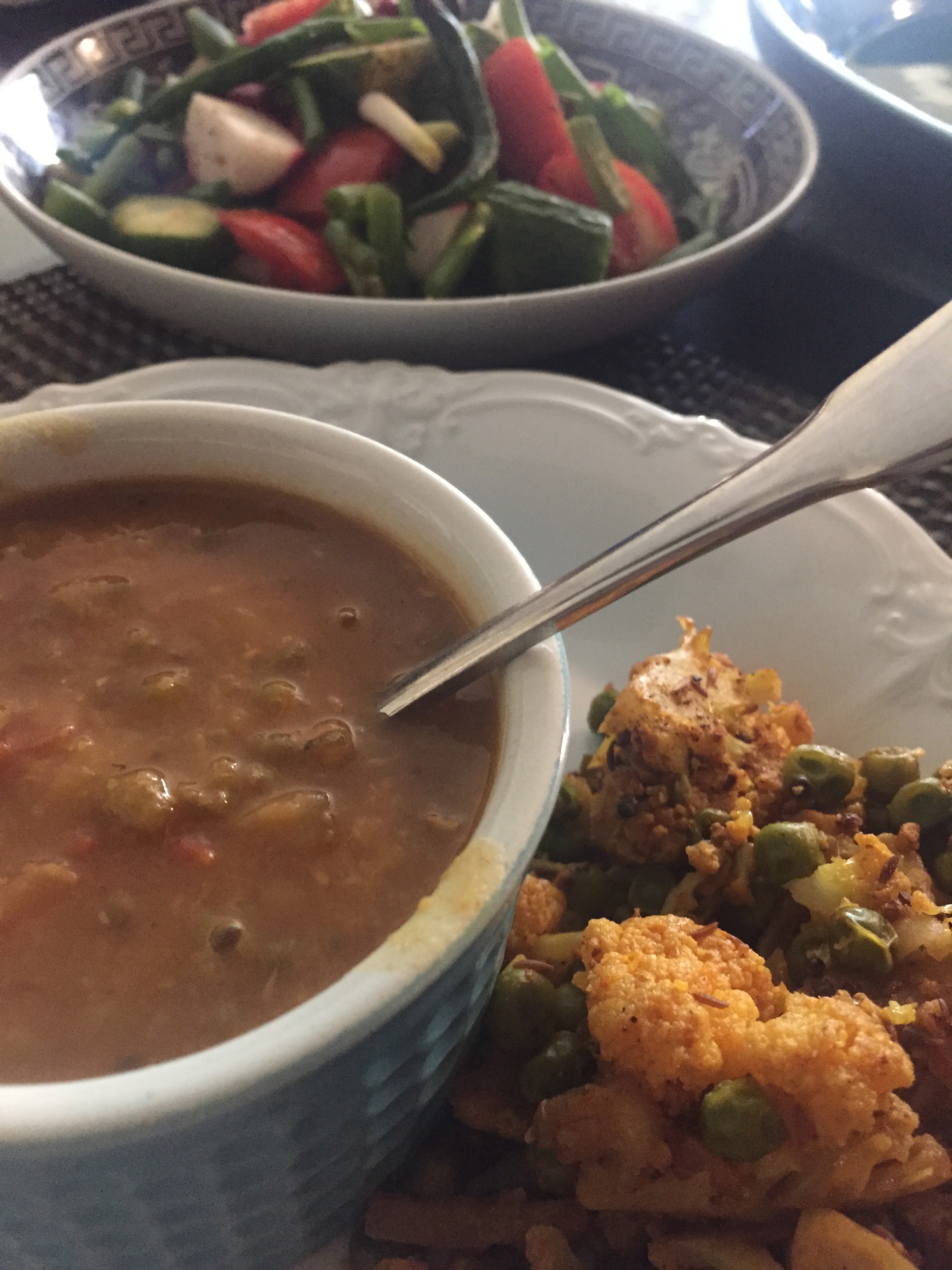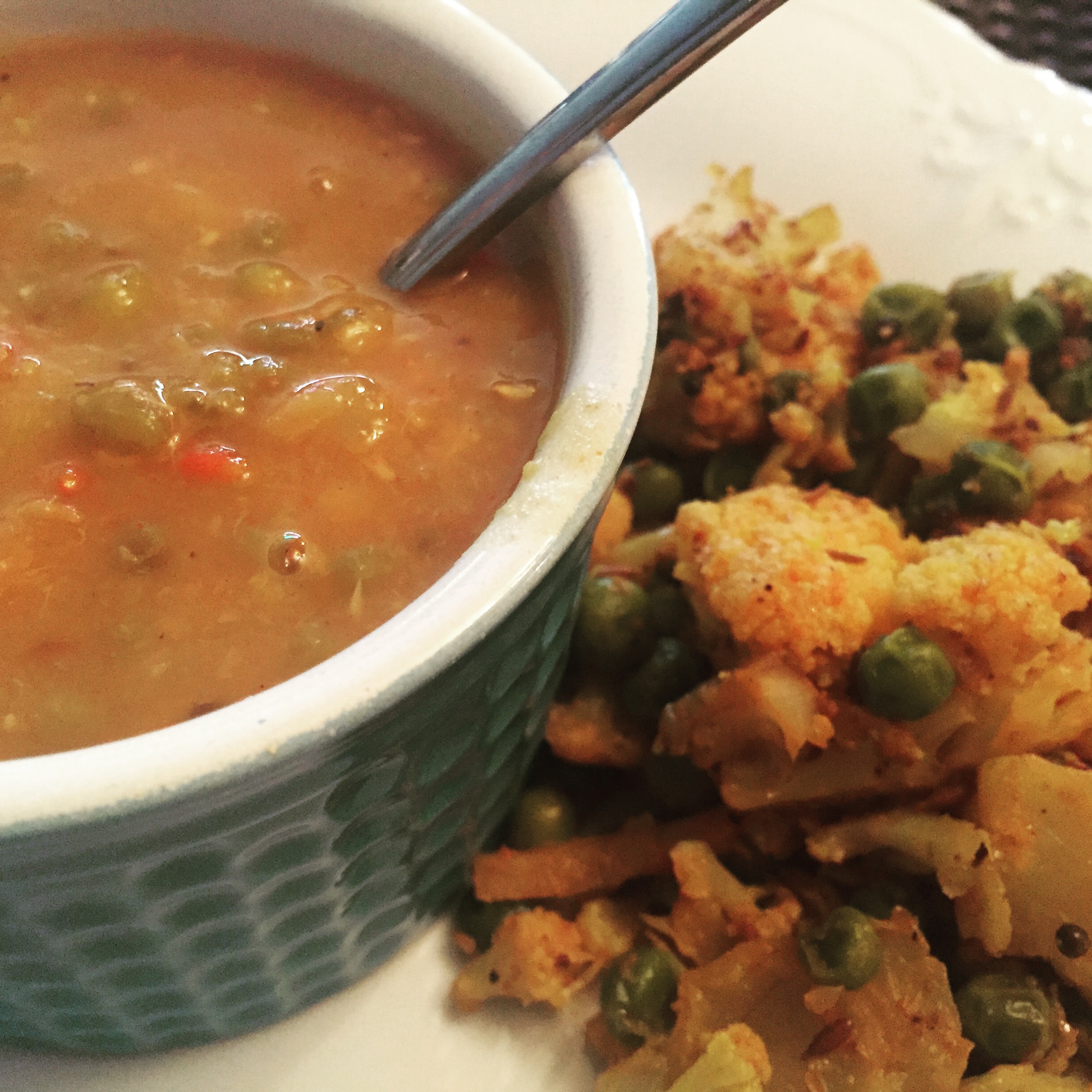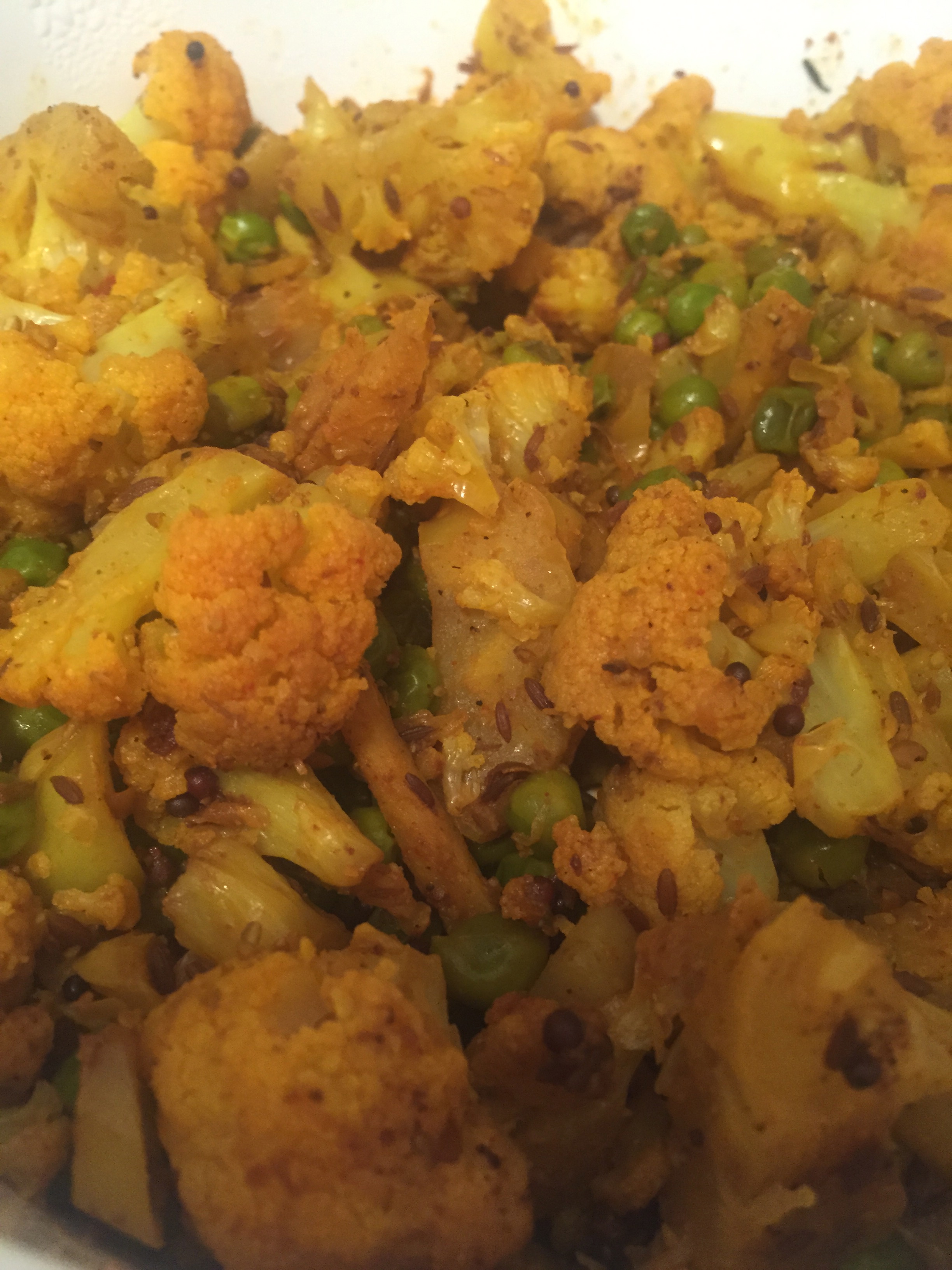 Check the cauliflower in about 5 to 7 minutes to see if it is cooked through by inserting a pairing knife-it should slide in easily. Once it is cooked to the desired consistency remove the lid, raise the heat to high and let any remaining water evaporate. Add the peas, stir and cook for another few minutes, or until the peas have heated through. Check the seasoning for salt.