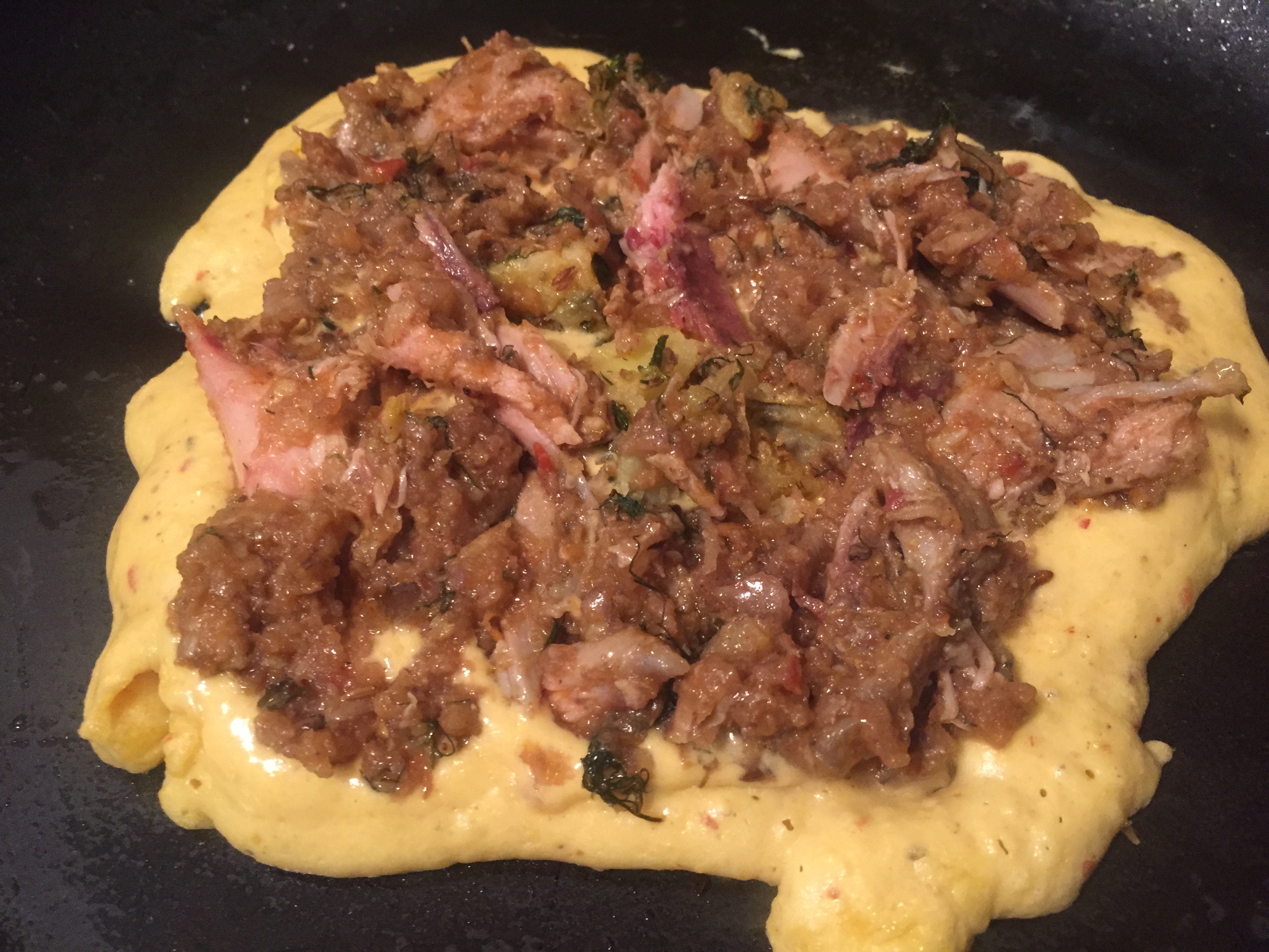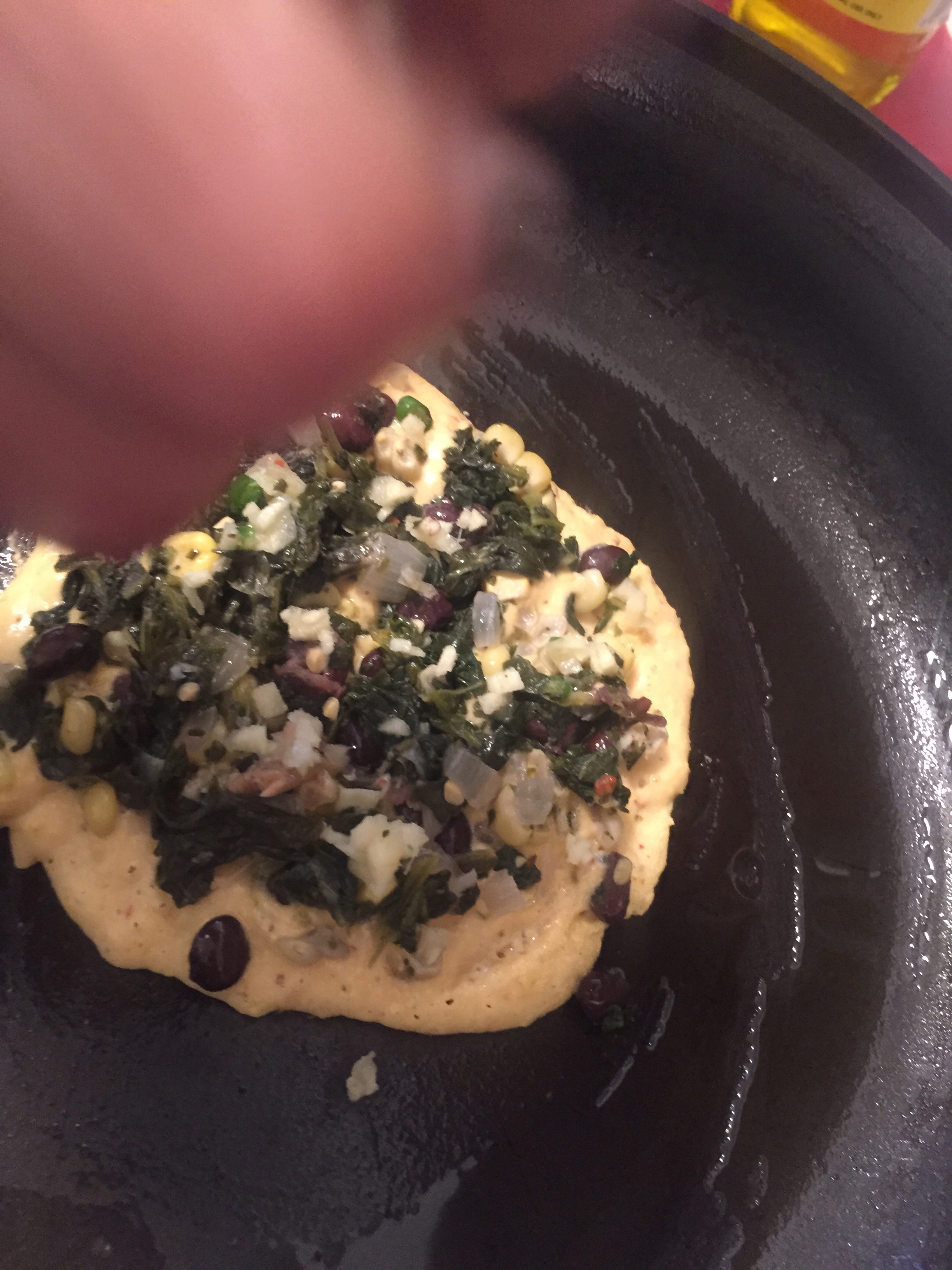 Heat a little oil in a non stick pan, add the batter and then the topping.  Let cook on a medium heat for a few minutes and then flip.