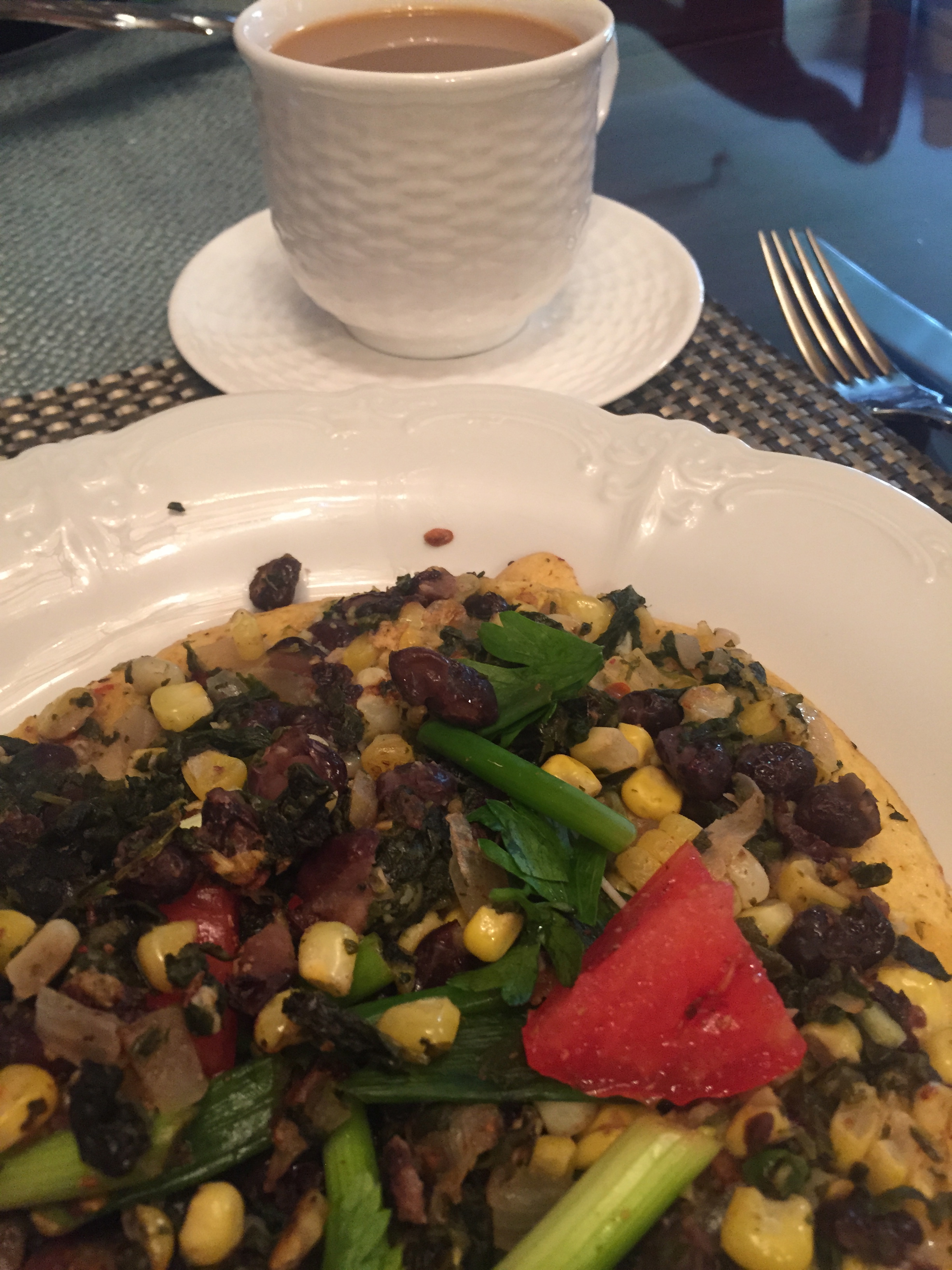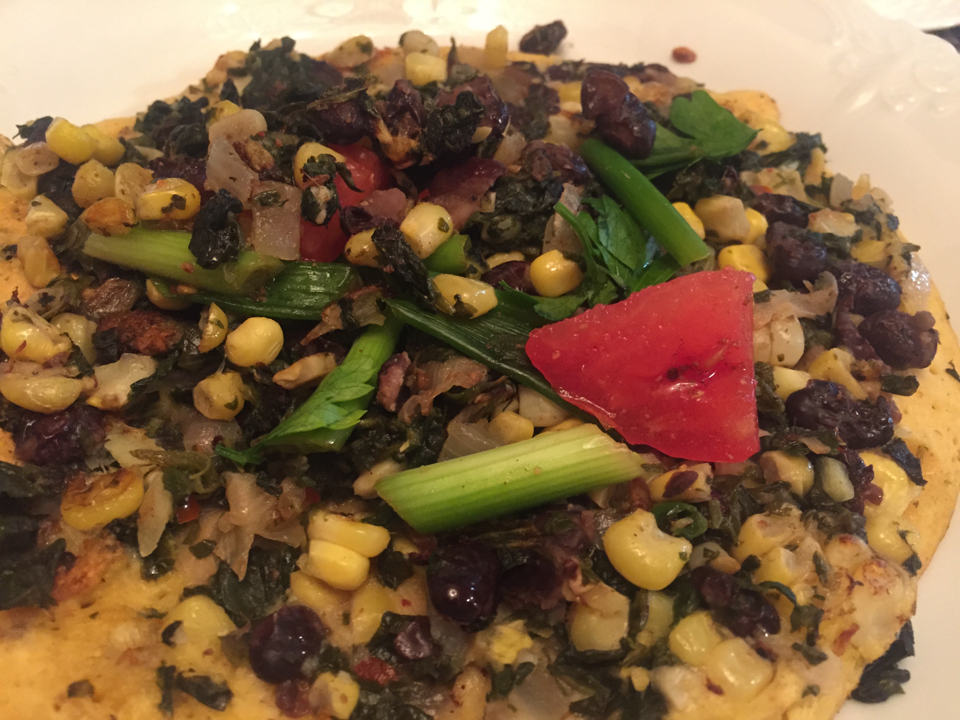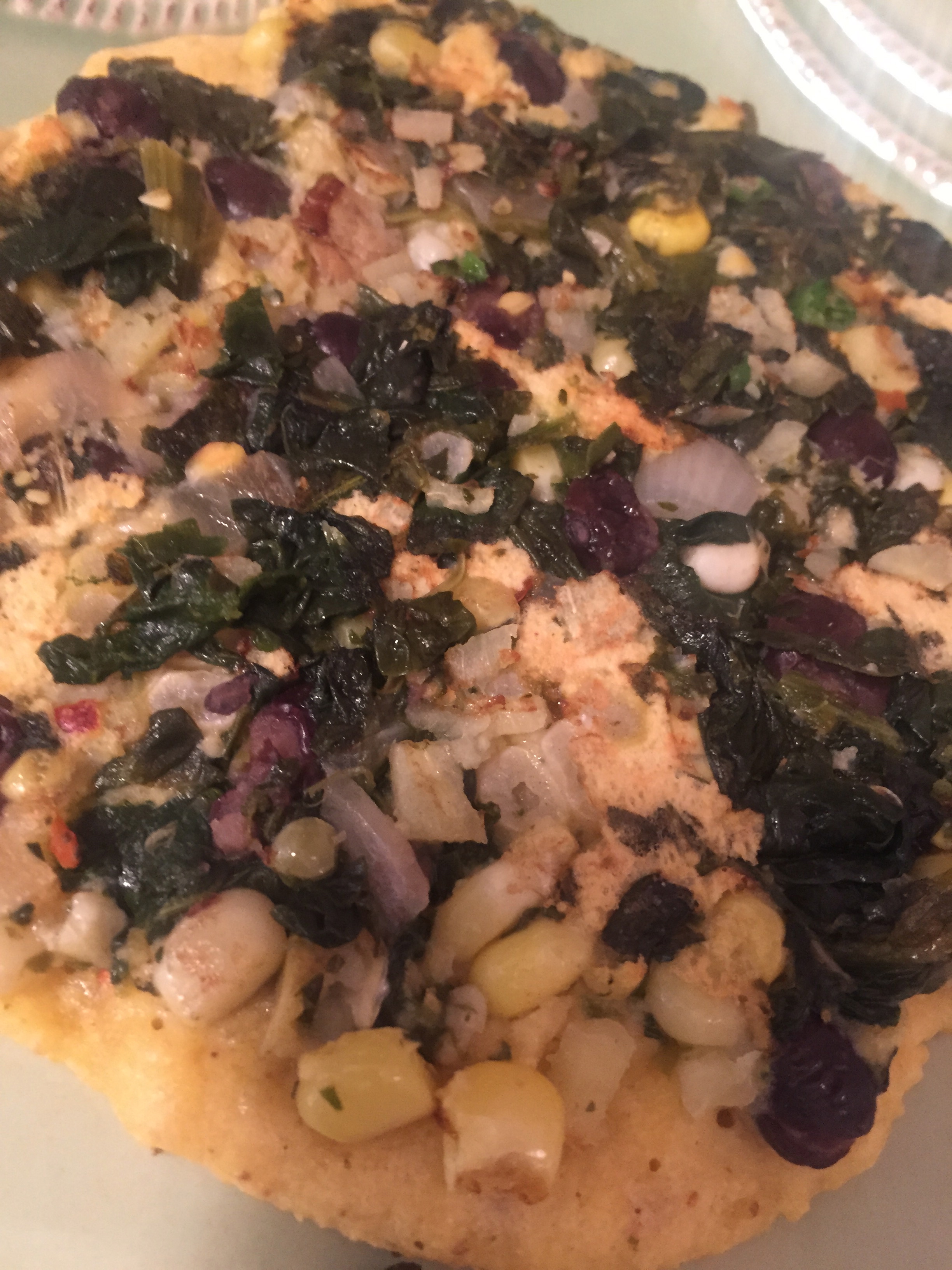 I used left overs – shredded chicken and on the other a mix of spinach, corn, black beans and onions.