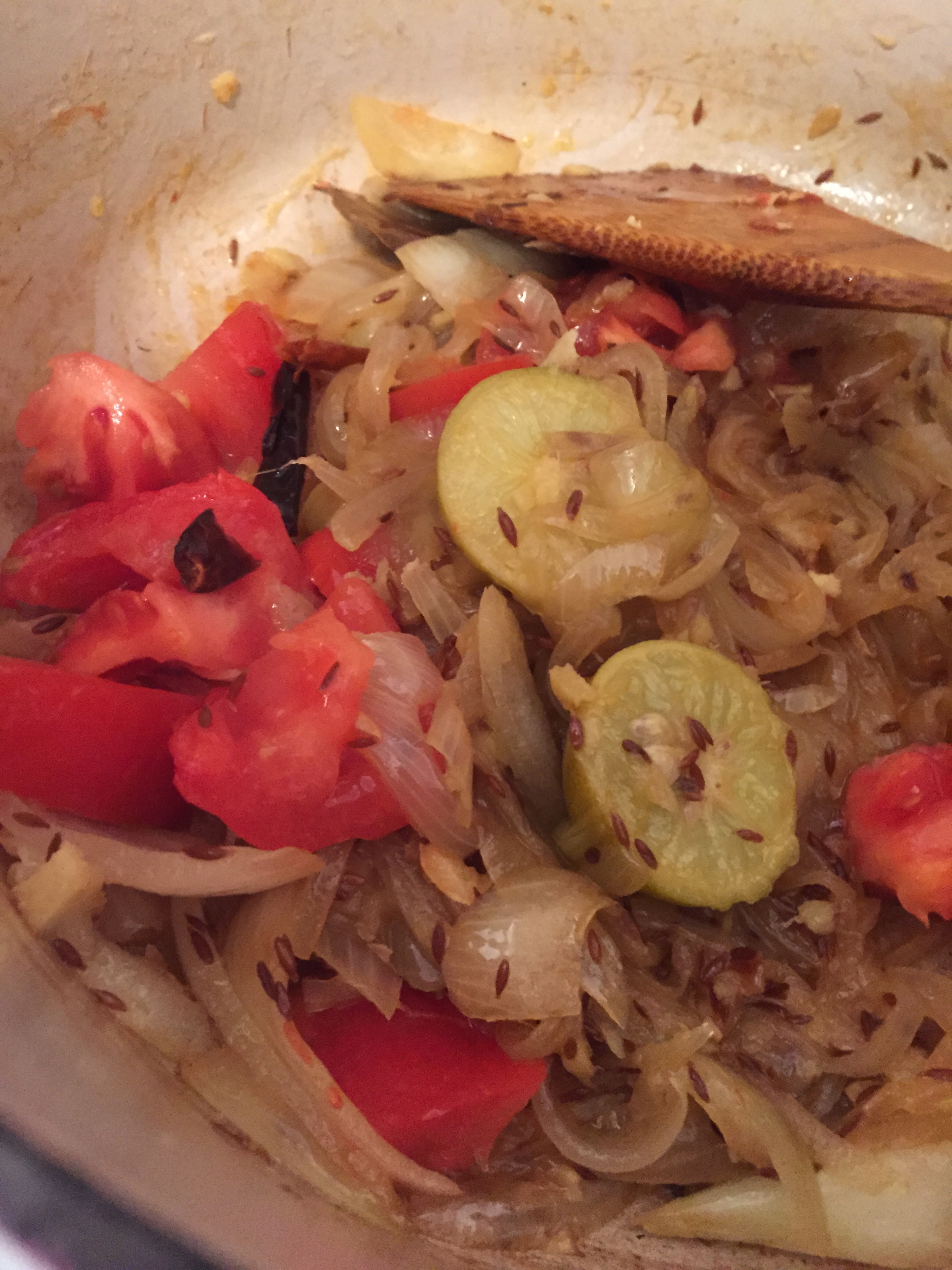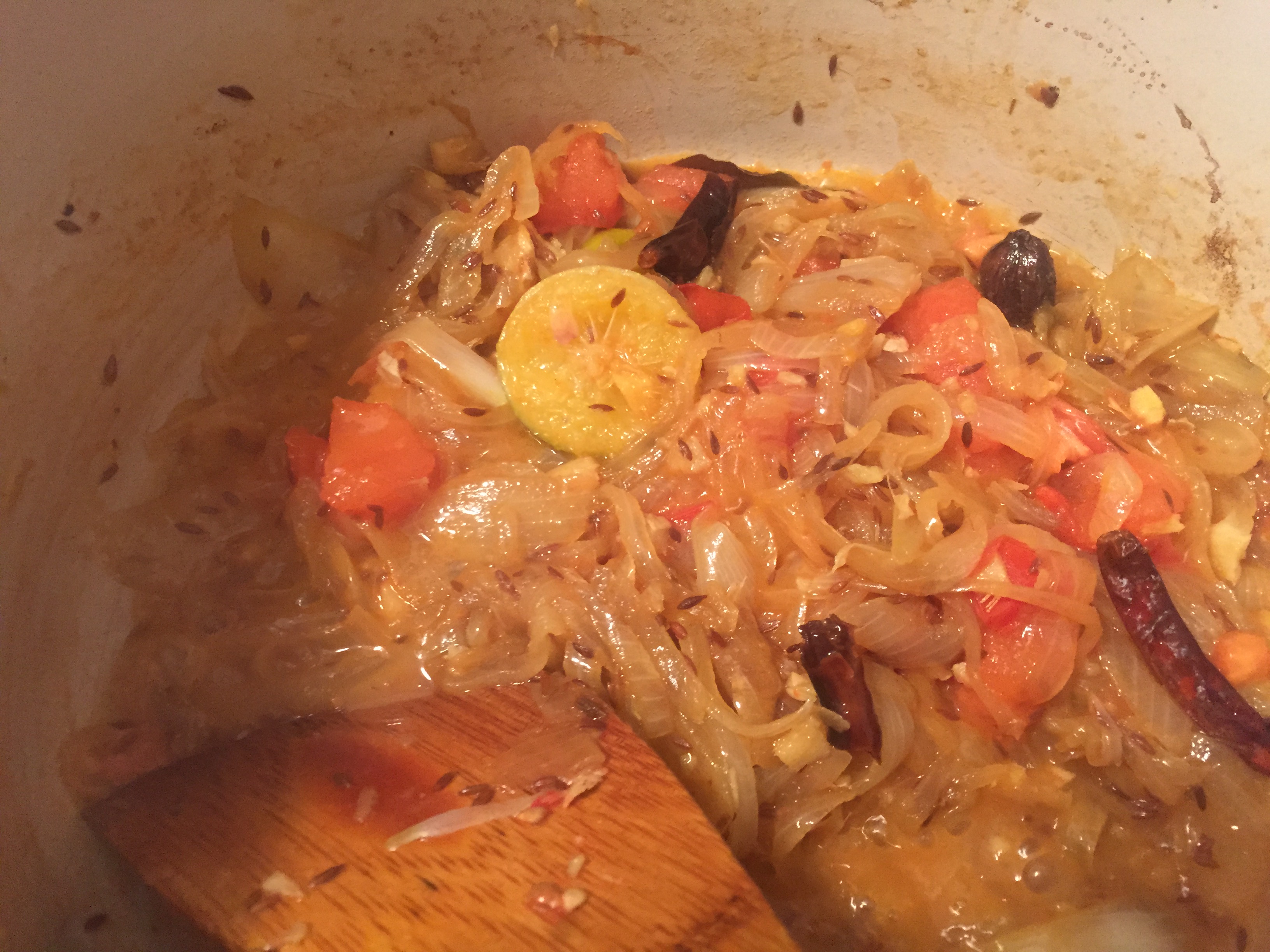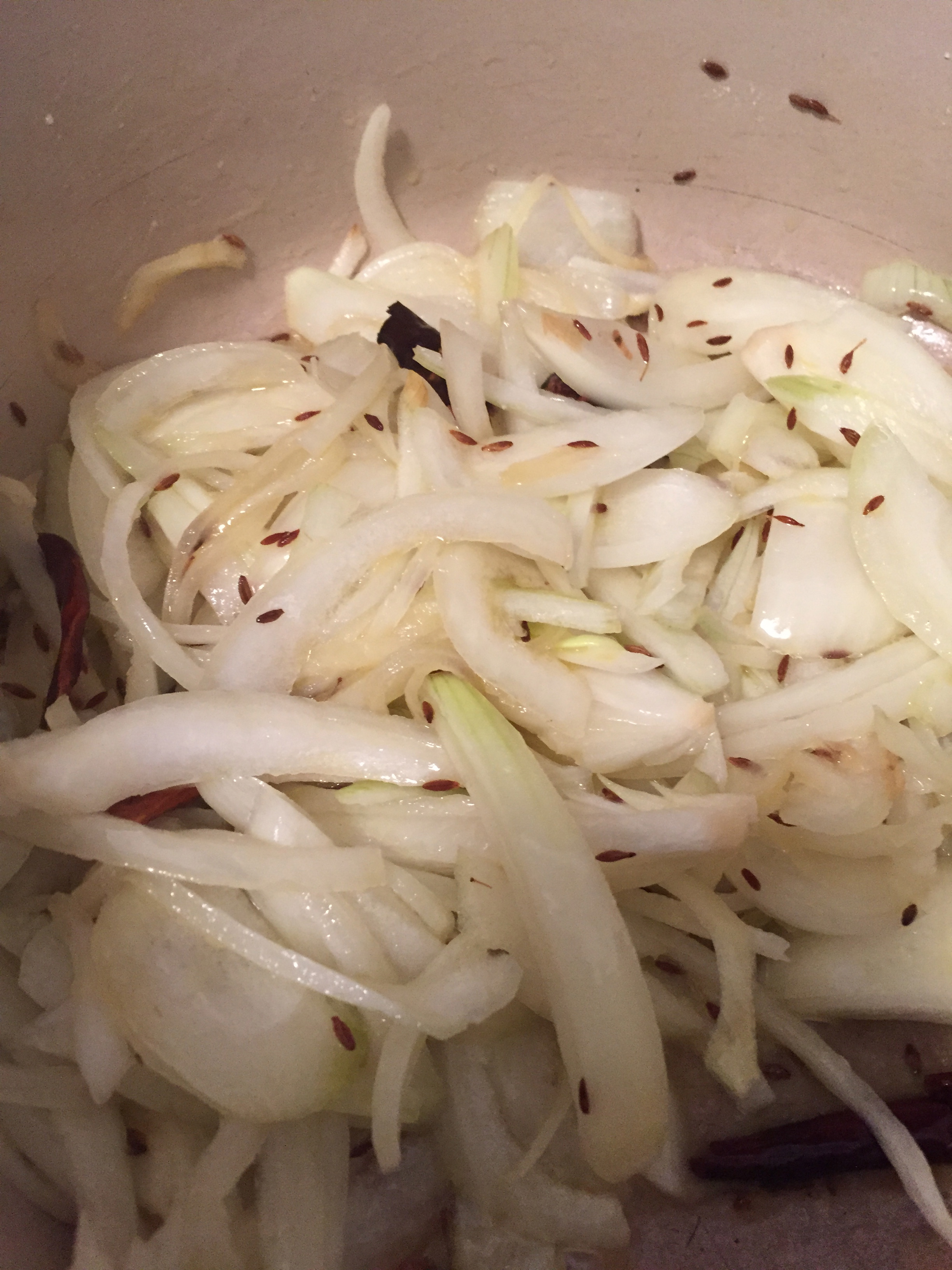Here I have mustard oil ( you can use any oil) with cumin seeds, a bay leaf, dry red chilies and a large black cardamom (you can use the green pods). I then add a sliced onion and salt. Stir and cook for a few minutes.