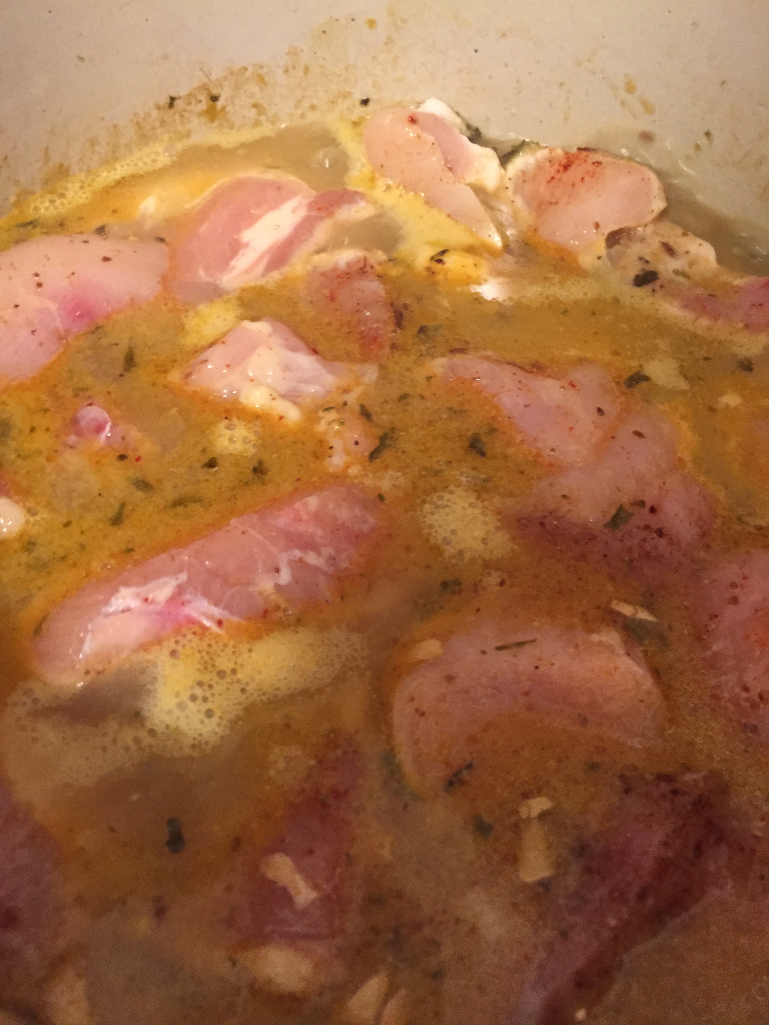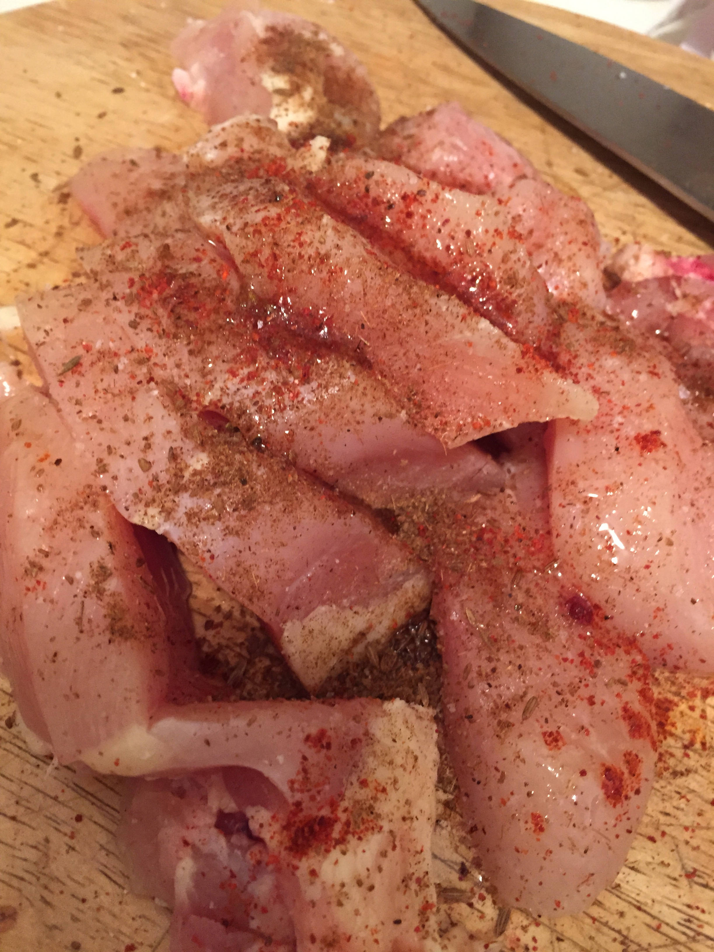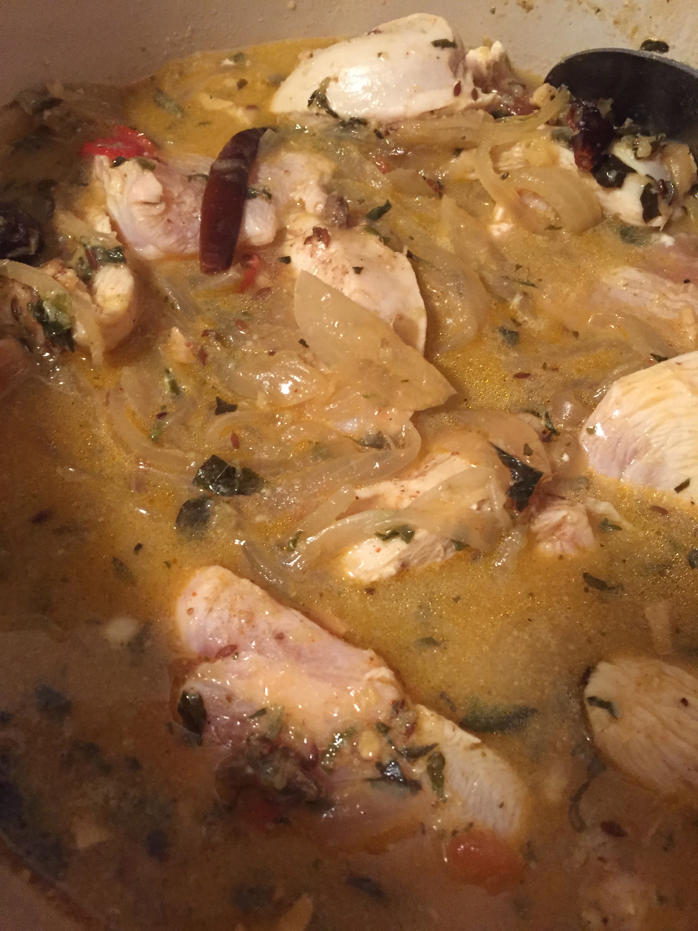 Slice a couple of chicken breasts or thighs and season with salt, cumin powder, coriander powder and cayenne pepper. Add to the simmering sauce and cook till the chicken is cooked through.