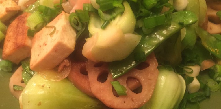 Next, brown the lotus root.  Add the ginger, onions and bokchoy and snow peas.  Cook over high heat for a few minutes and then add all the sauces except for the sesame oil.