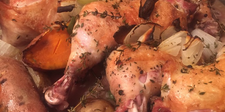Nestle the vegetables between the chicken and add a little more thyme leaves.