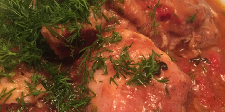 IMG_2545After the garlic and tomatoes, I covered and simmered the chicken for about 30 minutes and then add the potatoes – cooking for another 20 minutes or until the potatoes and chicken is cooked through.