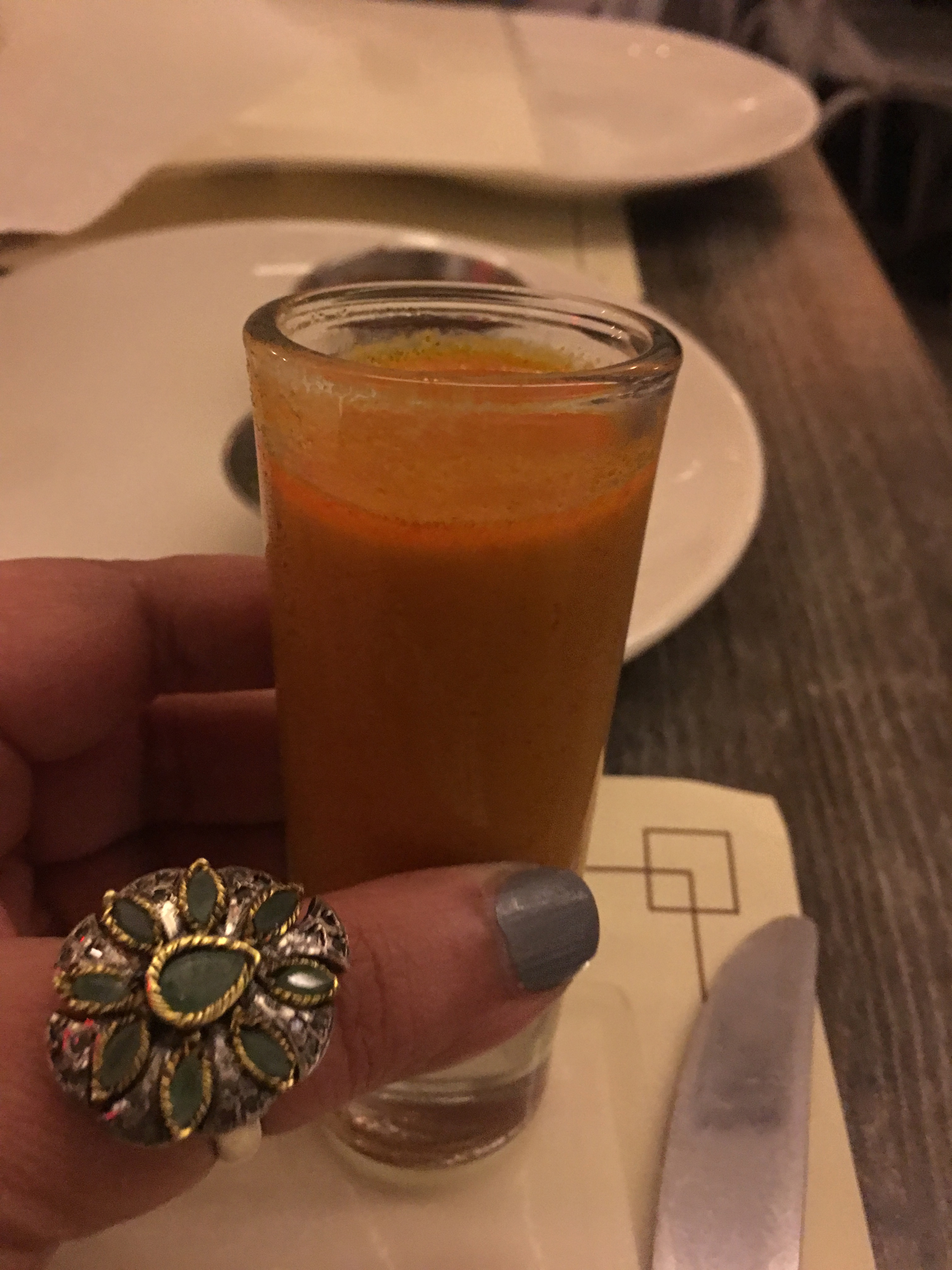 I arrived before my dining companion and was presented with this amuse bouche of what I think was a tomato soup with mustard seeds and a hint of a flavor of curry leaves.