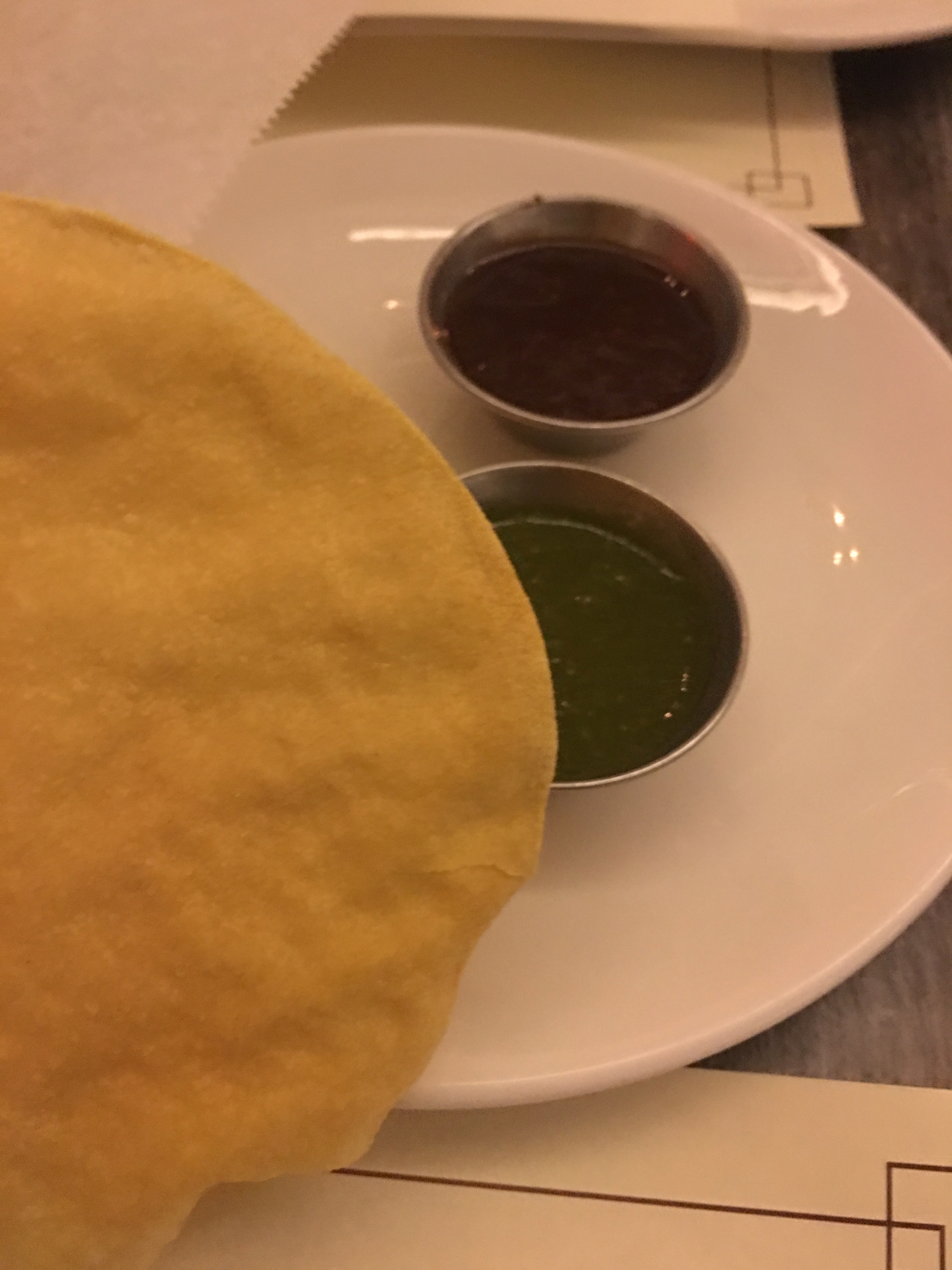 My friend arrived and we started munching on the pappadum and chutneys that were put in front of us.