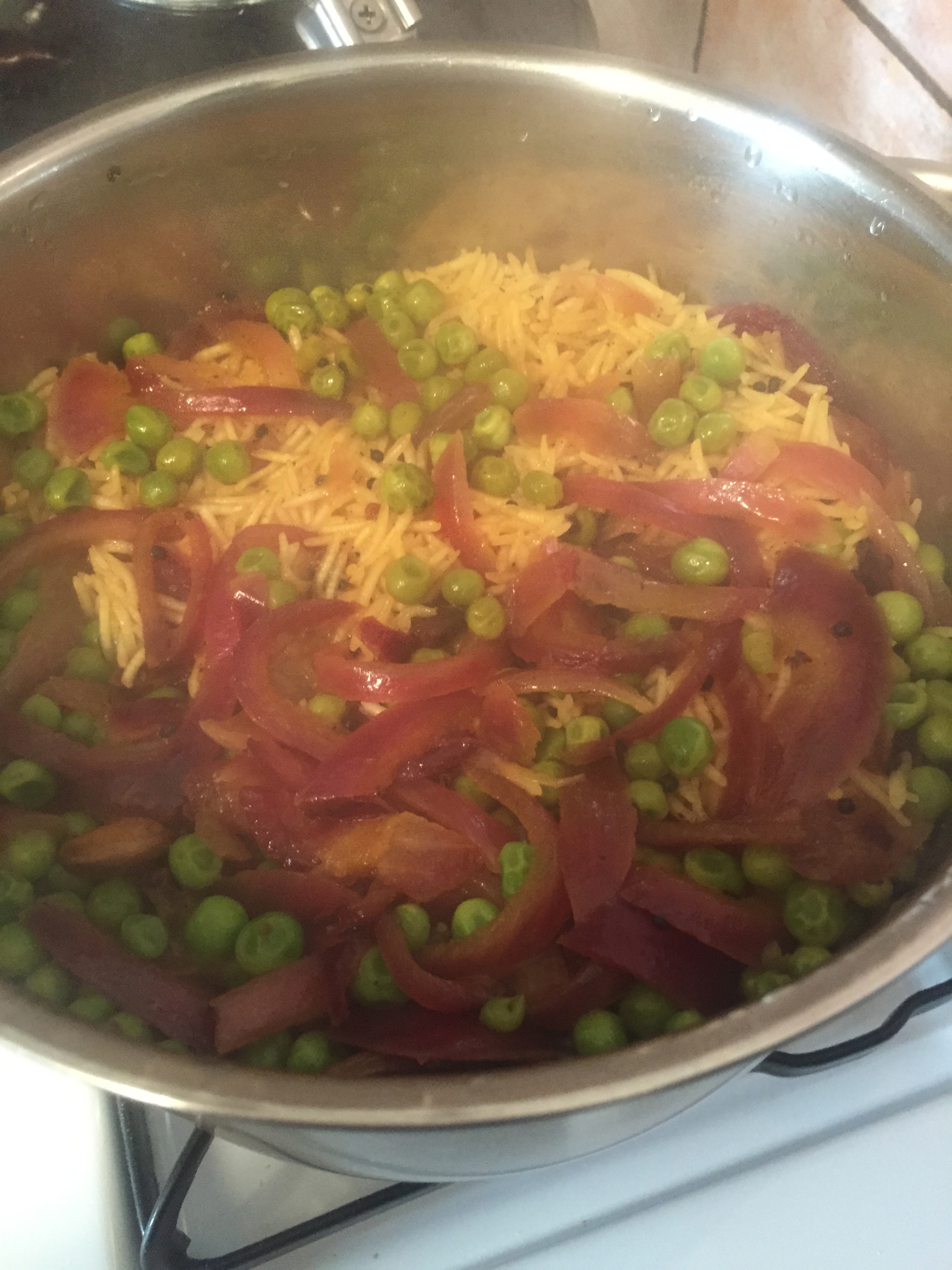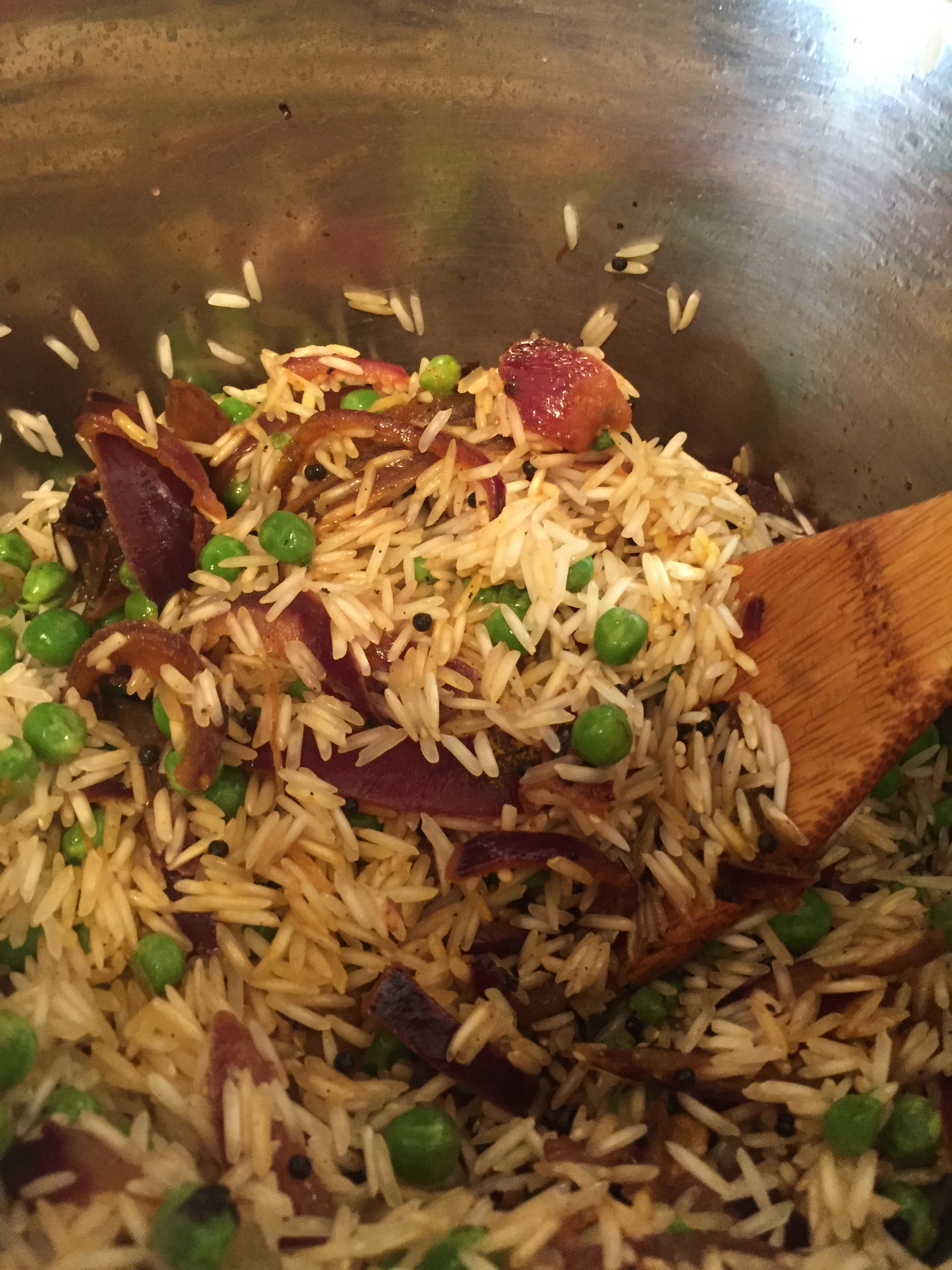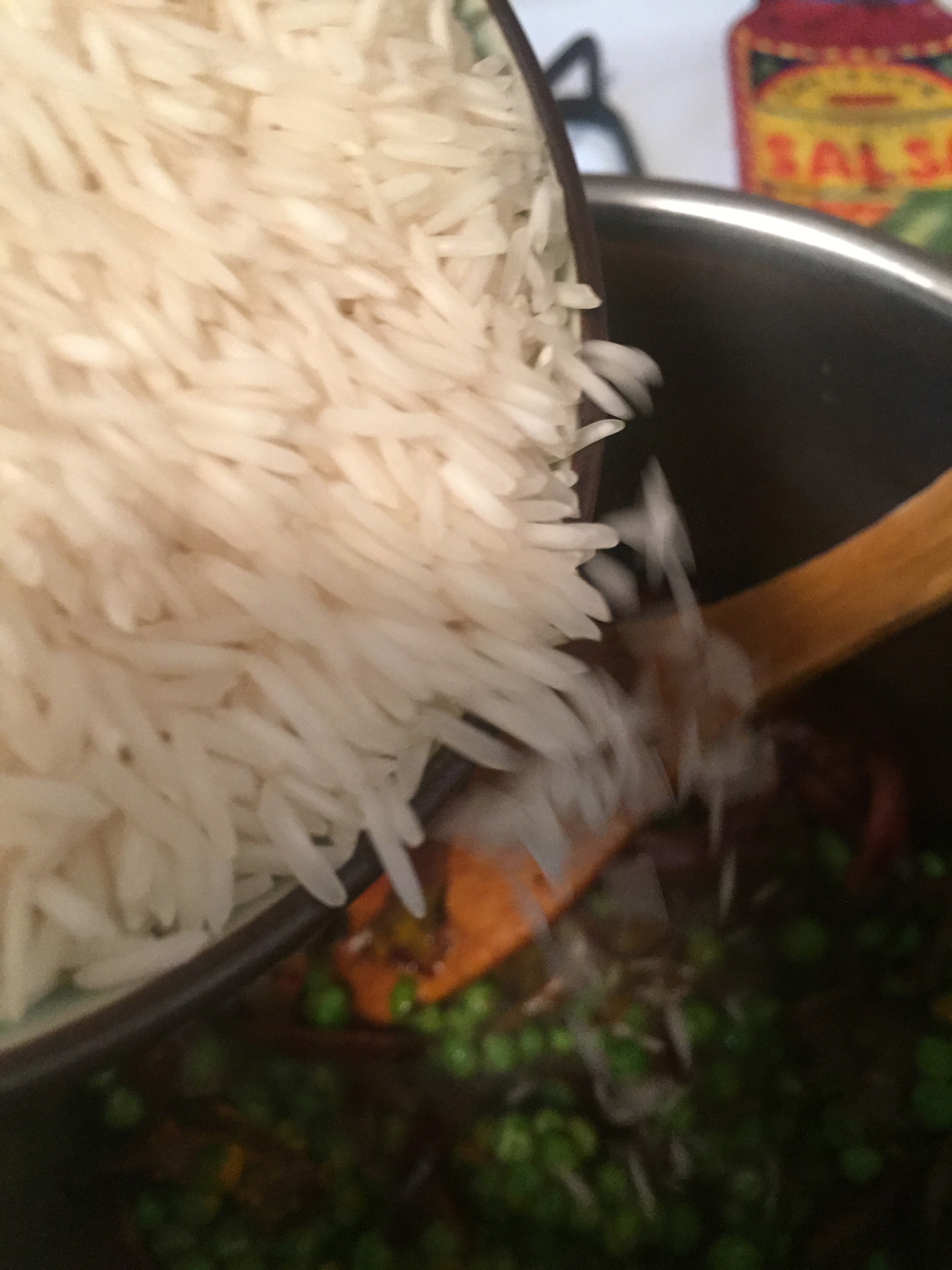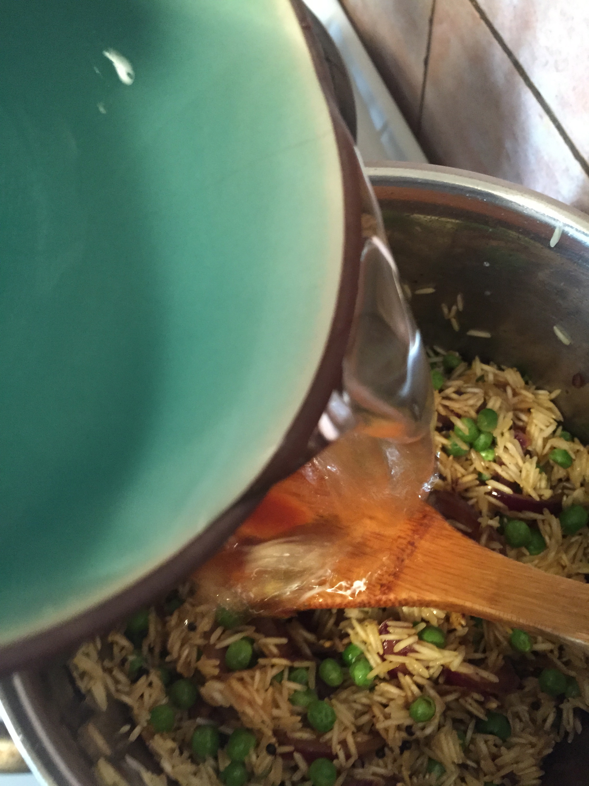 Stir the rice, onions and peas well for a couple of minutes. I like to brown the rice a little at this stage.
