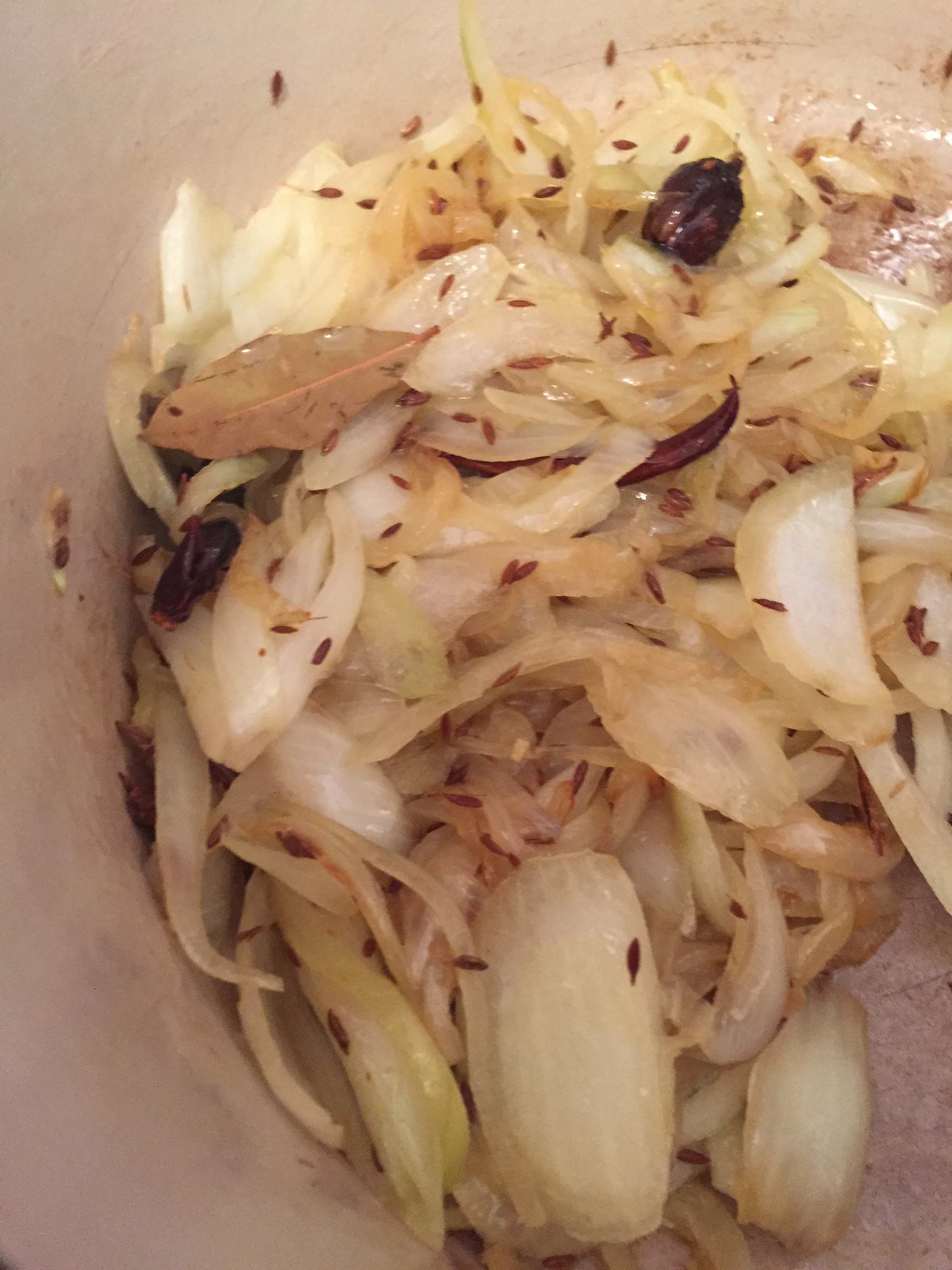 Add cumin seeds, a couple bay leaves, cardamom pods and dry red chillies if you have them.