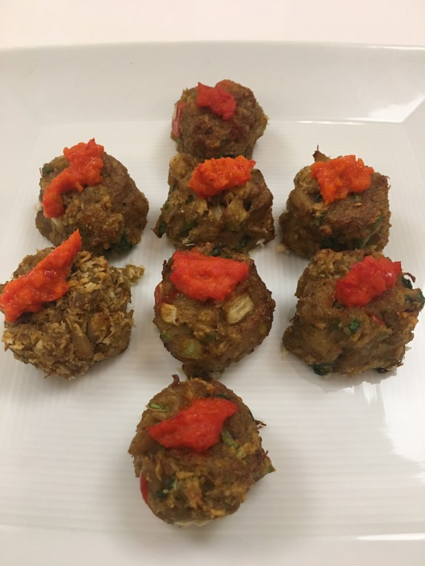 Crab cakes with red pepper relish