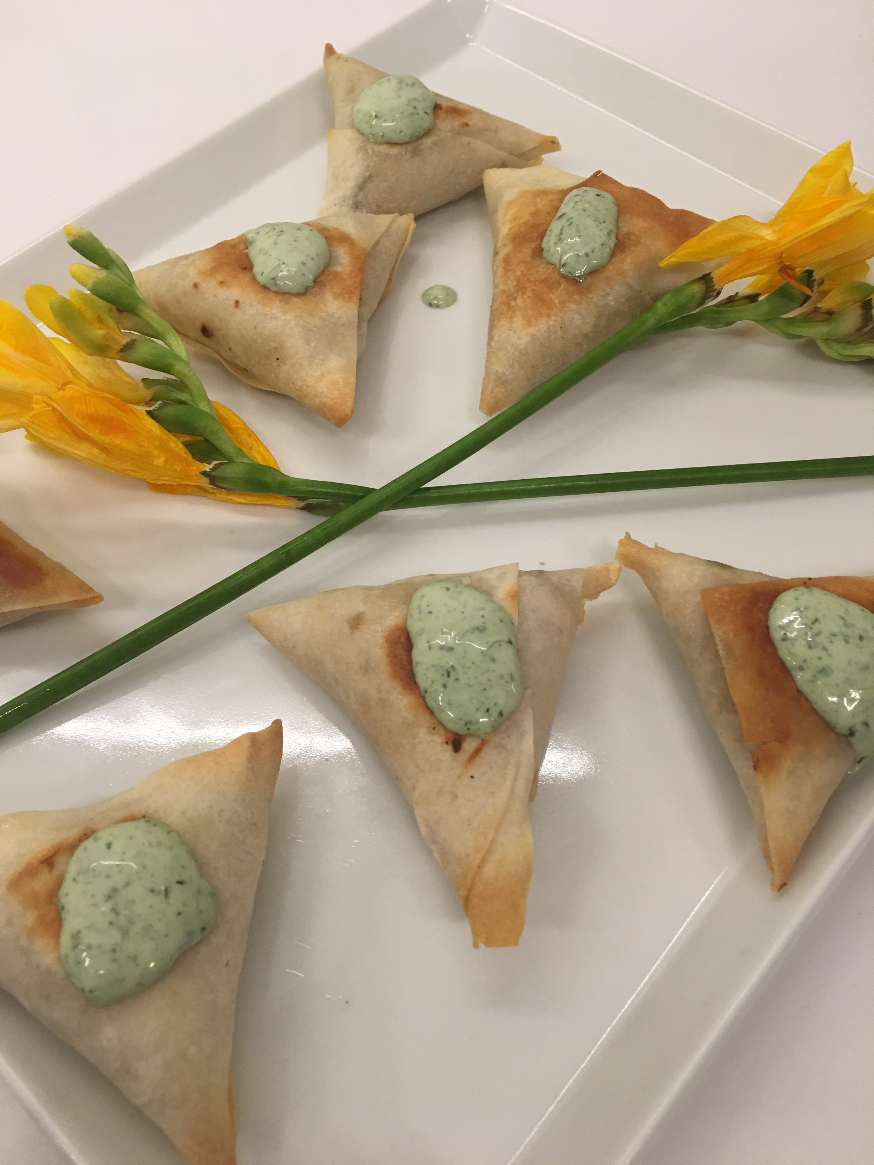 Mini potato and pea samosas with mint chutney