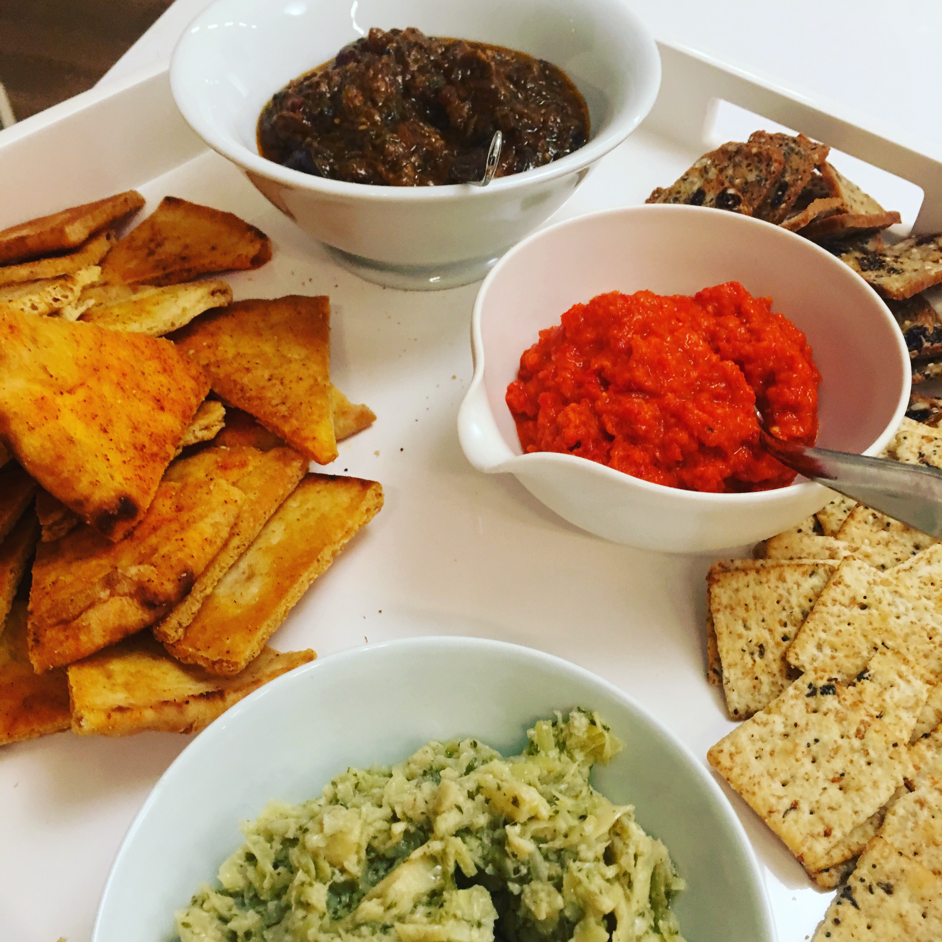 I put out a stationary platter with an artichoke Parmesan dip, eggplant purée with olives and a Turkish sweet pepper relish along with pita crisps and assorted crackers.